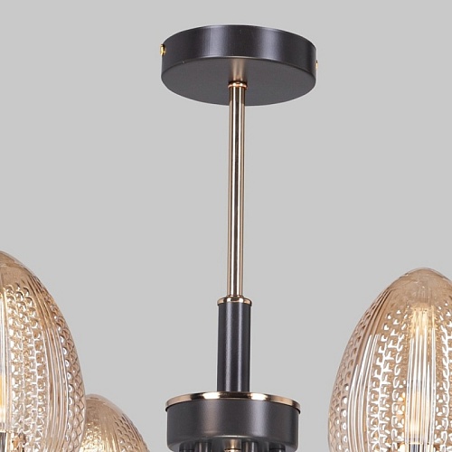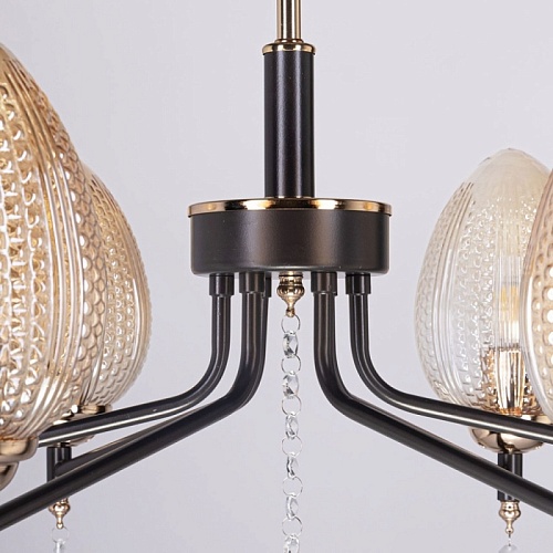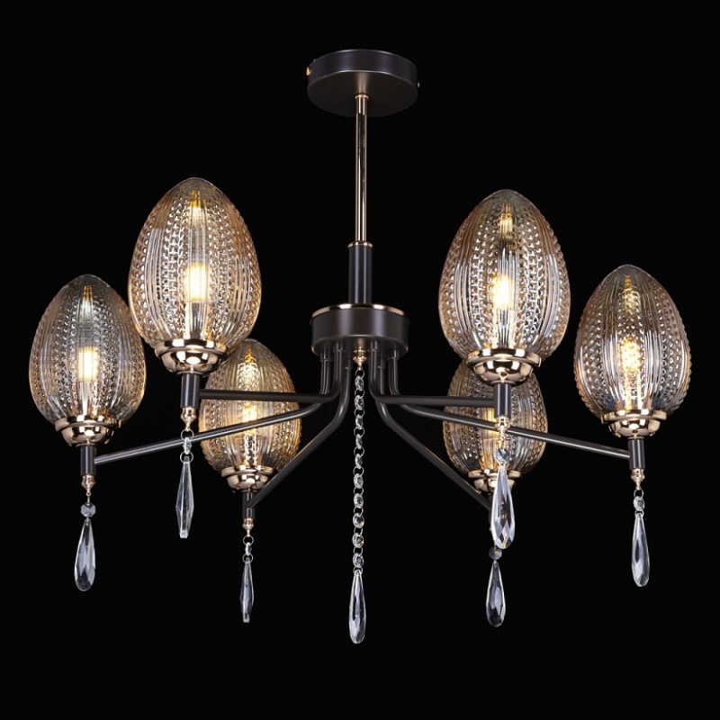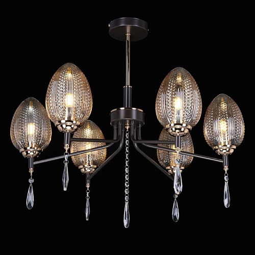 Металлическое основание потолочной люстры окрашено в цвет кофе. Отдельные элементы основания гальванизированы в цвет золота. Плафоны выполнены из фактурного стекла, отлитого в сложную форму и гальванизированного в цвет шампань. Потолочная люстра декорирована прозрачным хрусталем каплевидной формы.