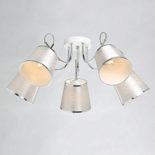 Металлическое основание потолочного светильника гальванизировано в цвет хрома. Отдельные элементы окрашены в белый цвет. Двухслойные текстильные абажуры выполнены из белого текстиля с геометрическим рисунком и термостойкого прозрачного акрила с внутренней стороны.