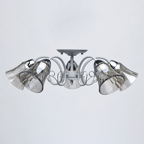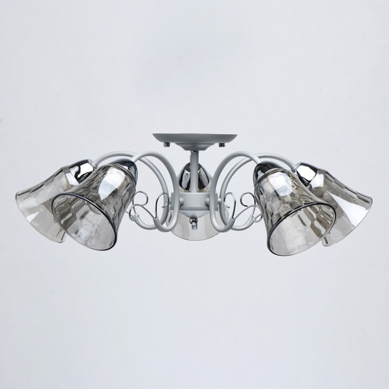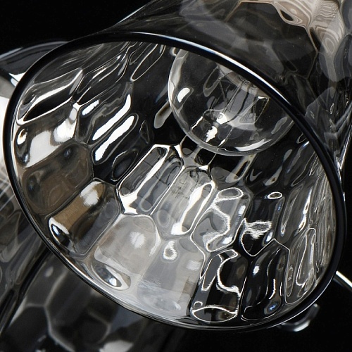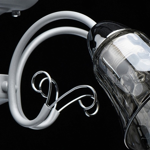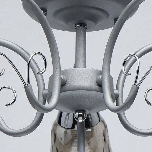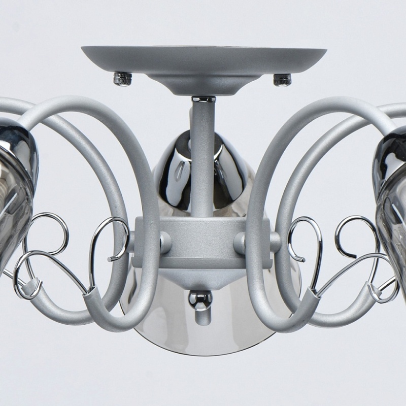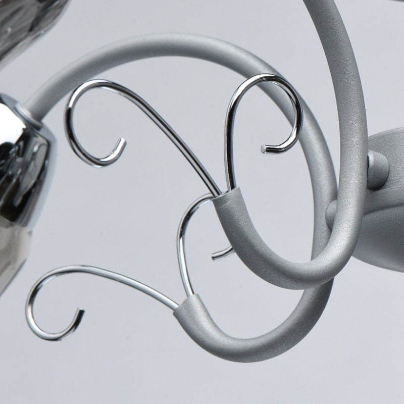 Металлическое основание светильника обработано по технологии порошкового окрашивания в серебряный цвет. Отдельные элементы основания гальванизированы в цвет хрома. Рельефные стеклянные плафоны отлиты в сложную форму и гальванизированы в дымчатый цвет.