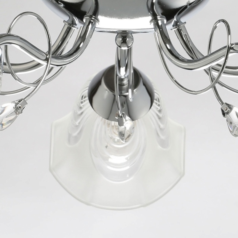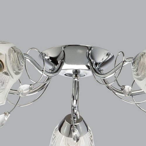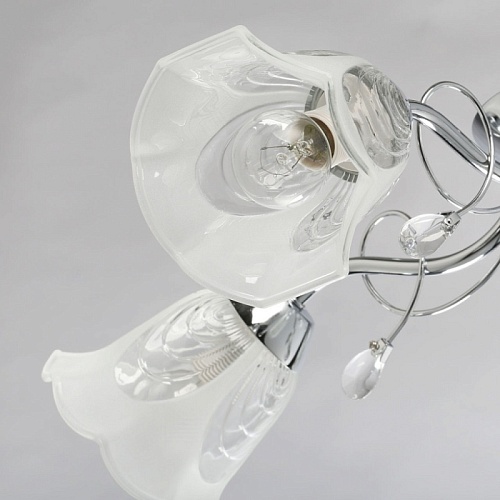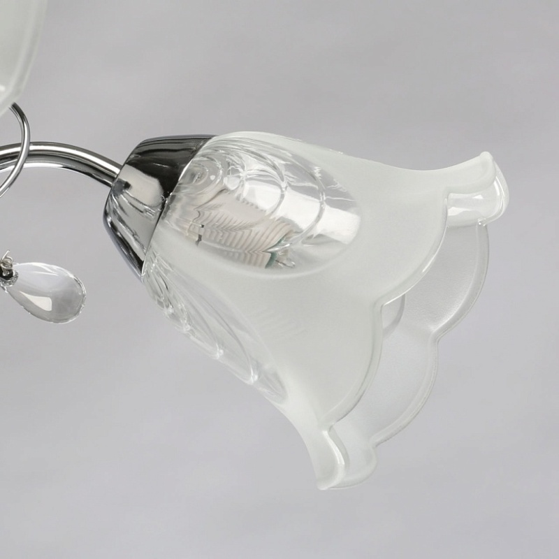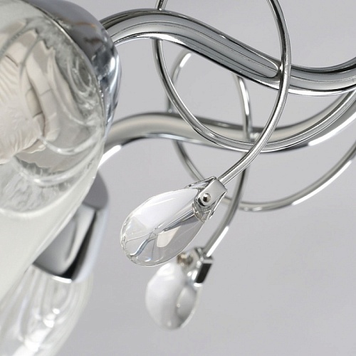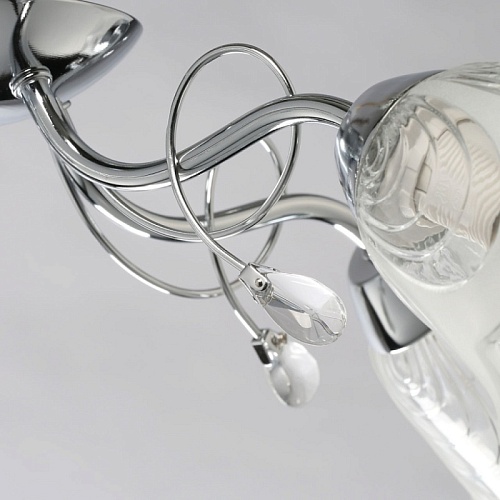 Металлическое основание гальванизировано в цвет хрома. Стеклянные плафоны отлиты в сложную форму и матированы. Светильник декорирован хрустальным стеклом миндалевидной формы.