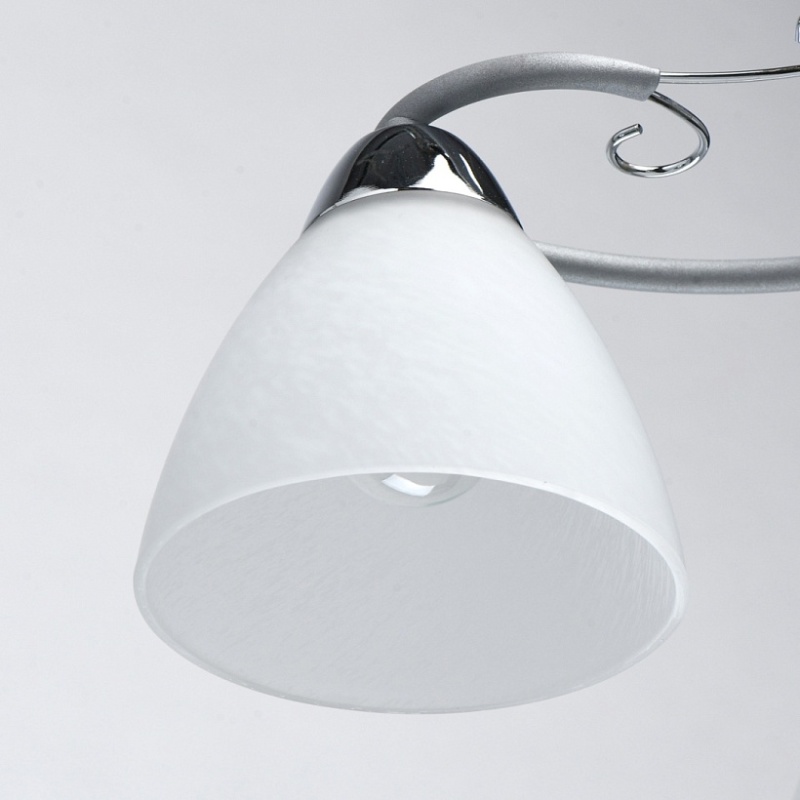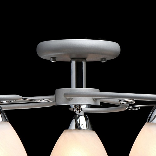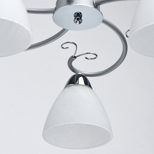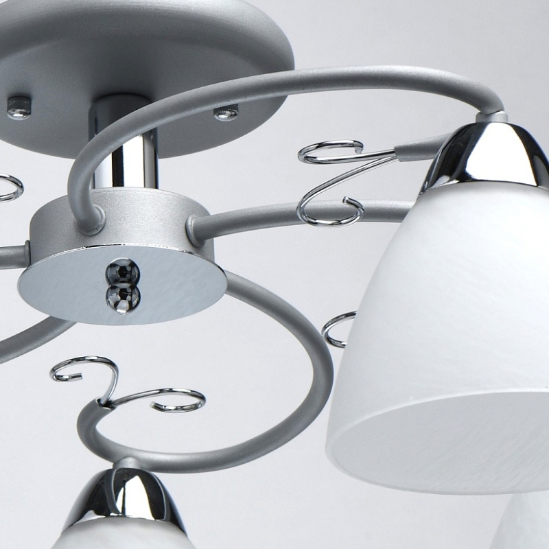 Металлическое основание светильника обработано по технологии порошкового окрашивания в цвет серебра. Отдельные элементы основания гальванизированы в цвет хрома. Стеклянные плафоны матированы и окрашены изнутри в белый цвет в виде капель, нанесенных вручную.