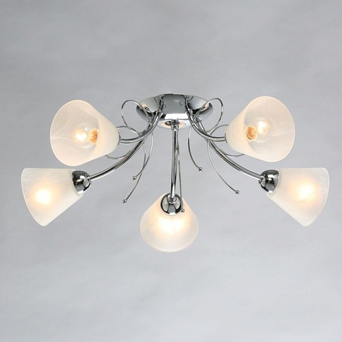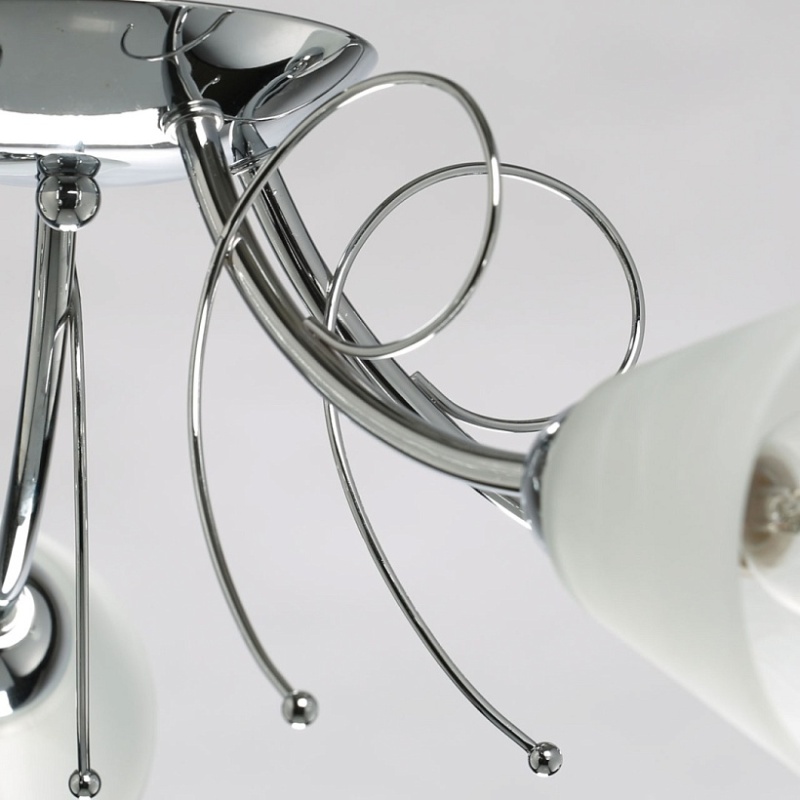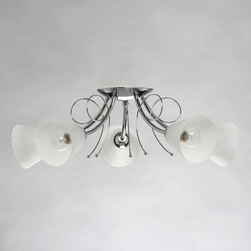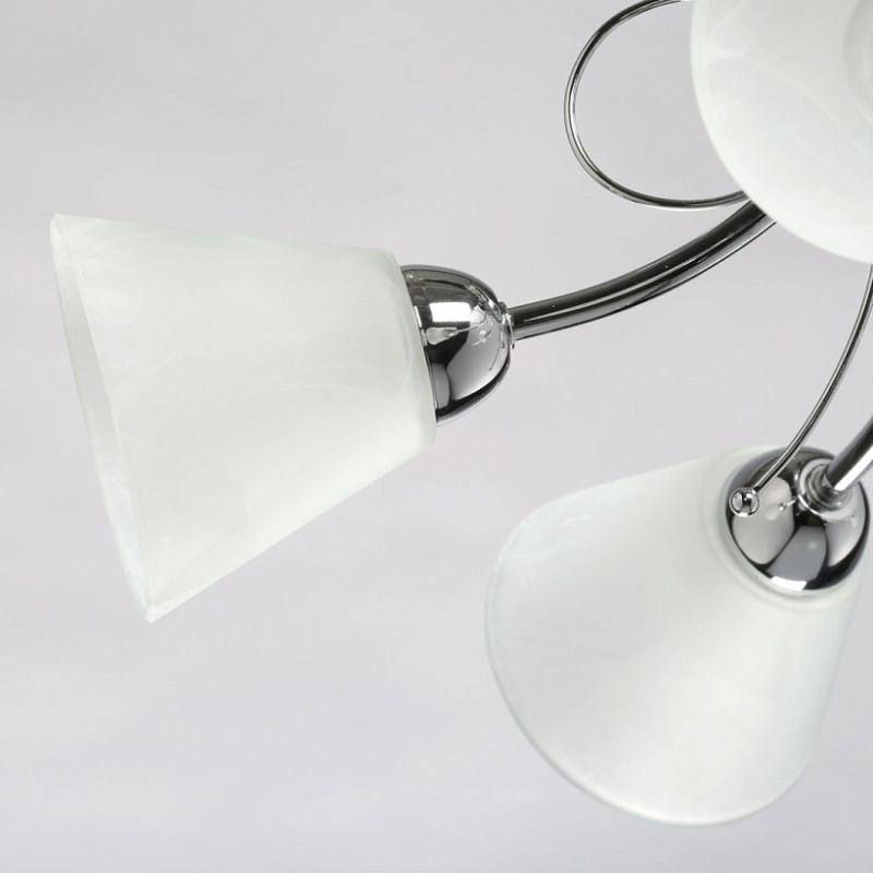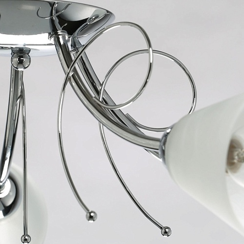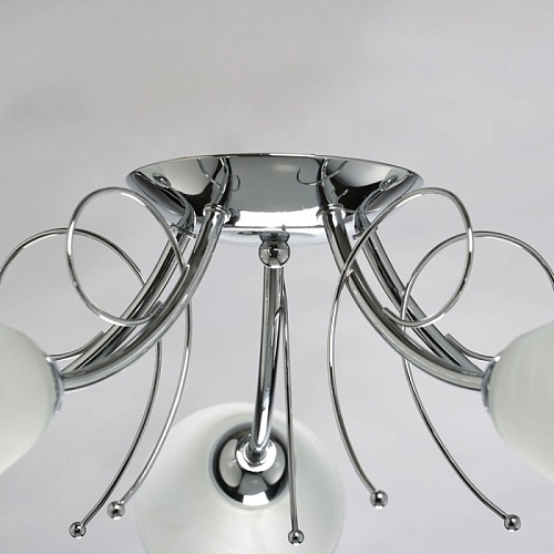 Металлическое основание светильника гальванизировано в цвет хрома. Светильник декорирован плафонами из алебастрового стекла.