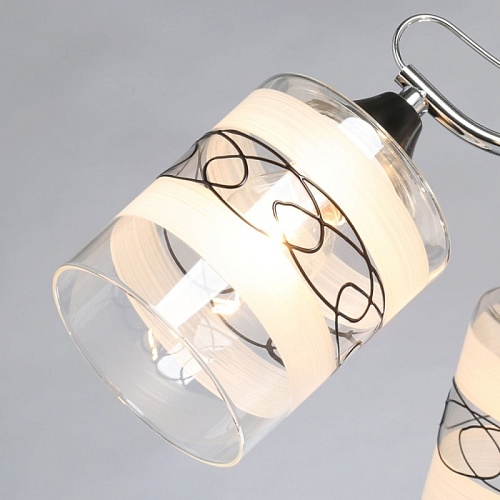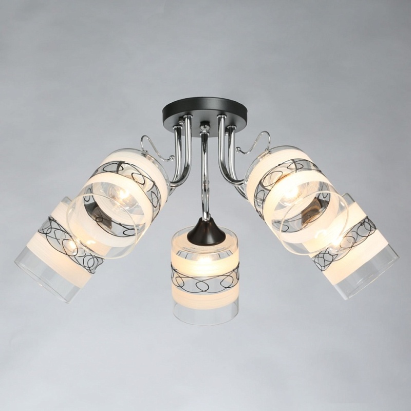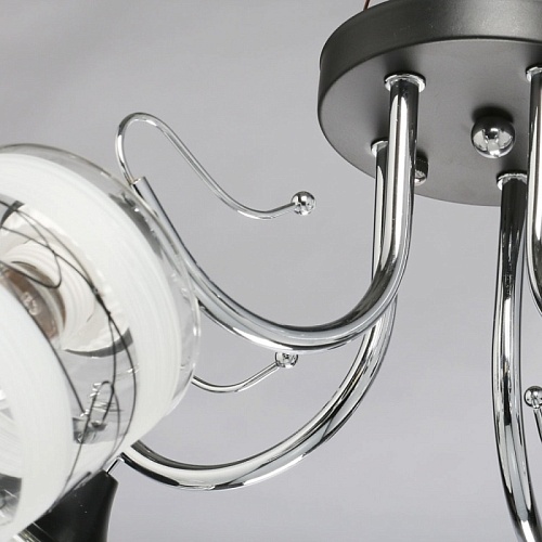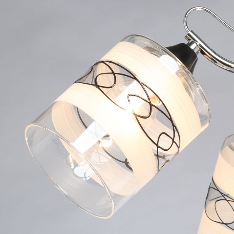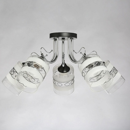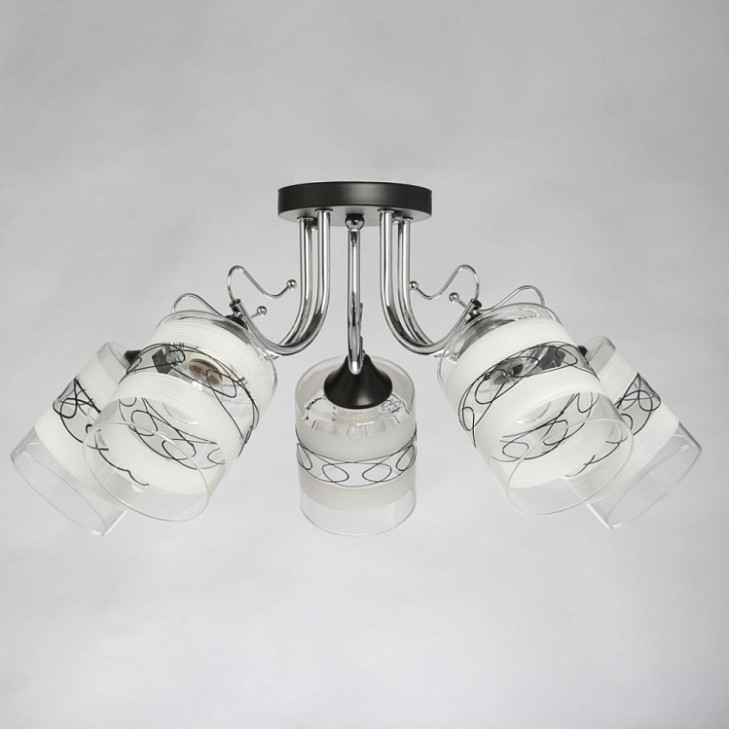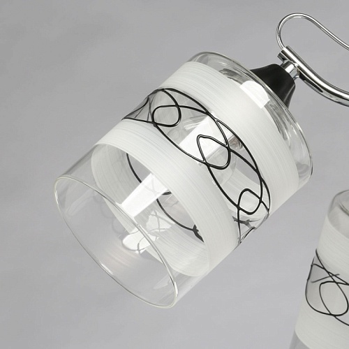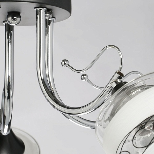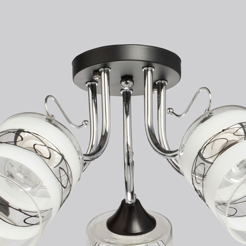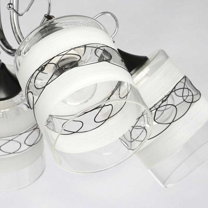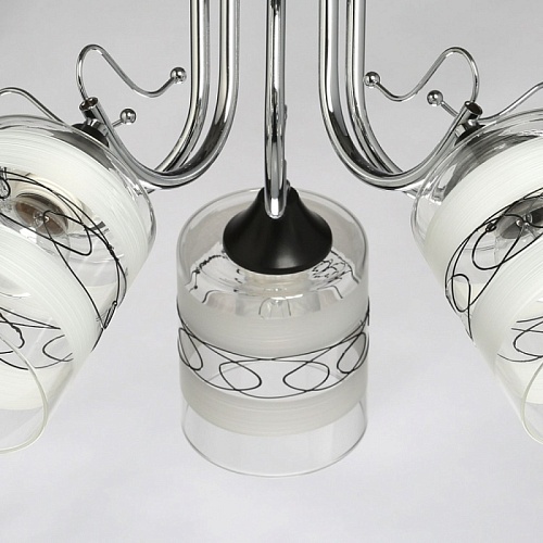 Основание светильника выполнено из металла. Потолочная чаша и держатели плафонов окрашены в черный цвет, рожки гальванизированы в цвет хрома. Стеклянные плафоны матированы по трафарету. Также, на плафоны нанесен геометрический рисунок черного цвета.