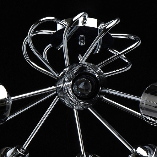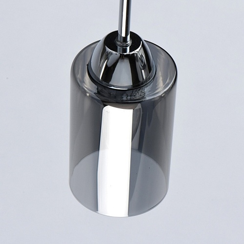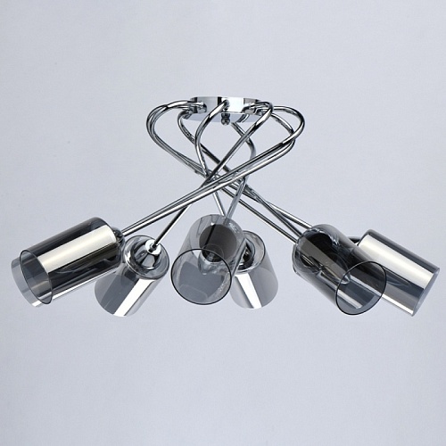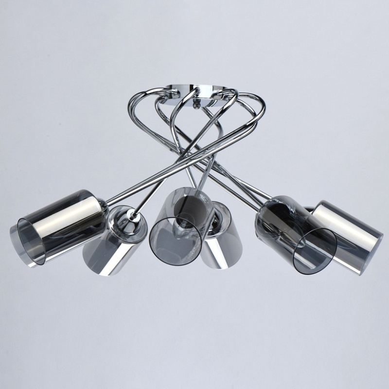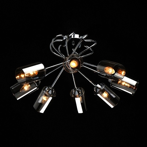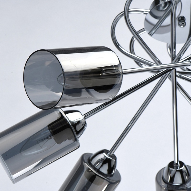 Основание светильника выполнено из металла и гальванизировано в цвет хрома. Стеклянные плафоны гальванизированы в дымчатый цвет.