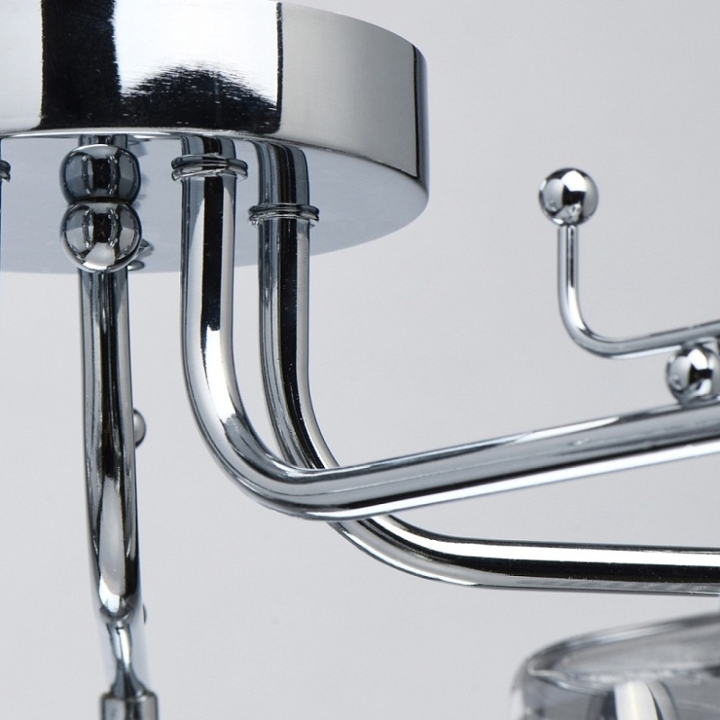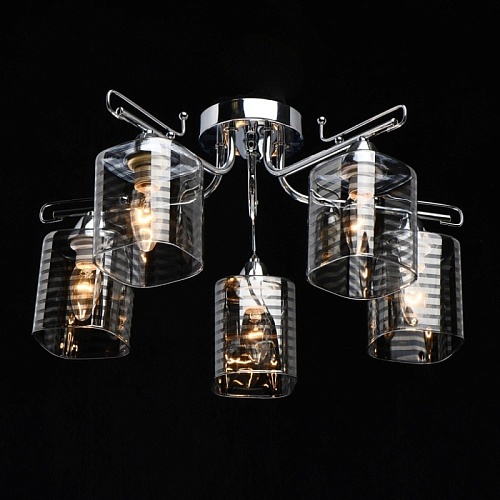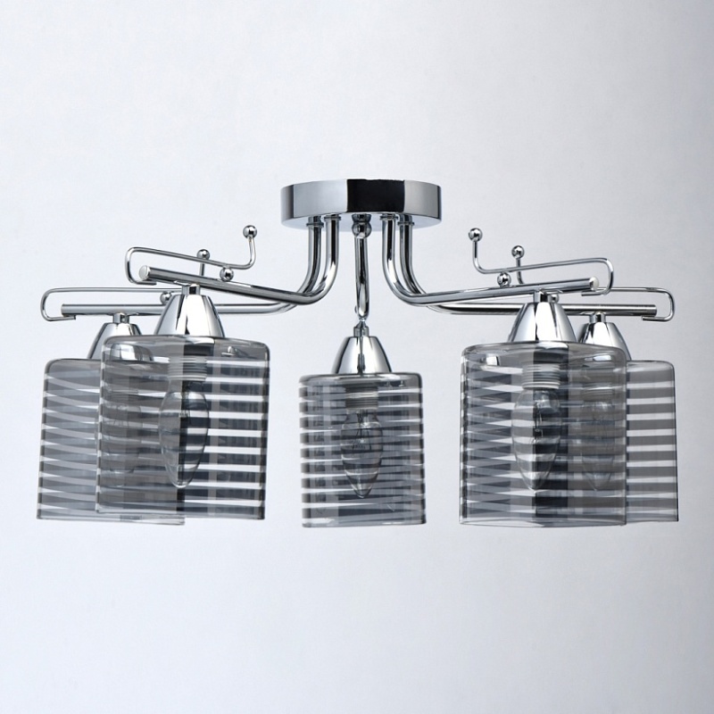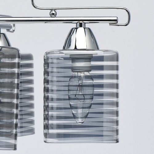 Металлическое основание гальванизировано в цвет хрома. Стеклянные плафоны гальванизированы в дымчатый цвет по трафарету в полоску.