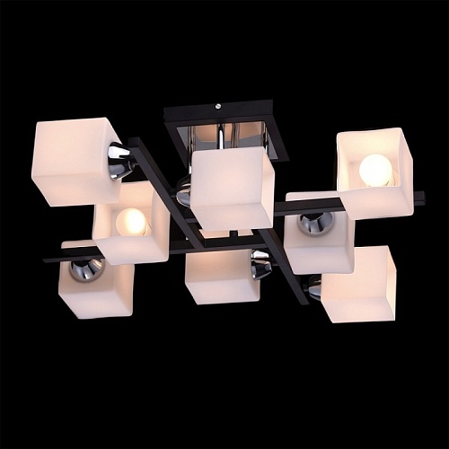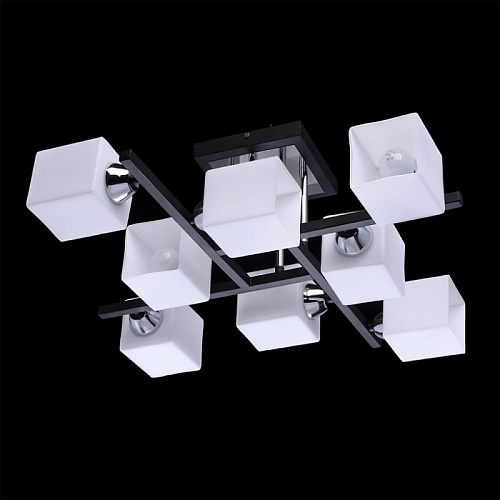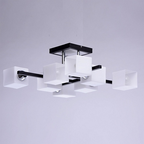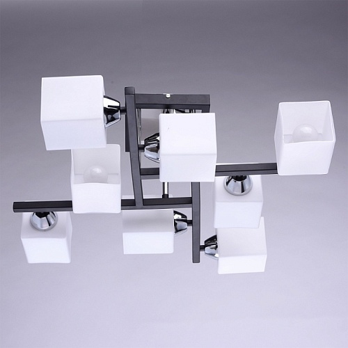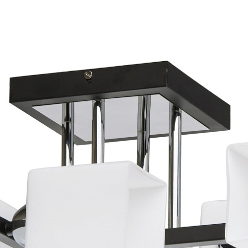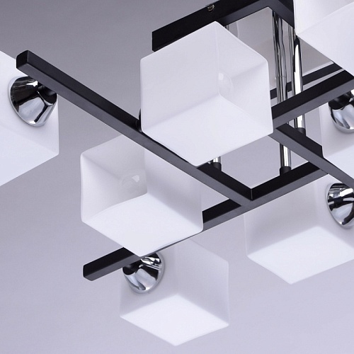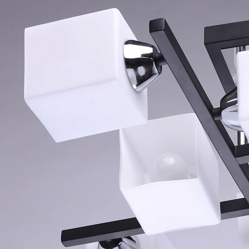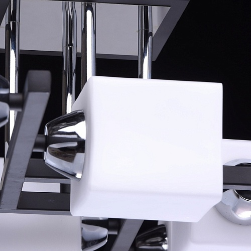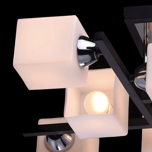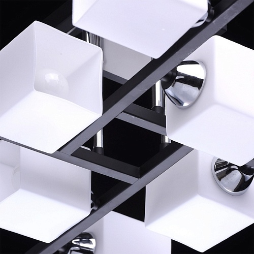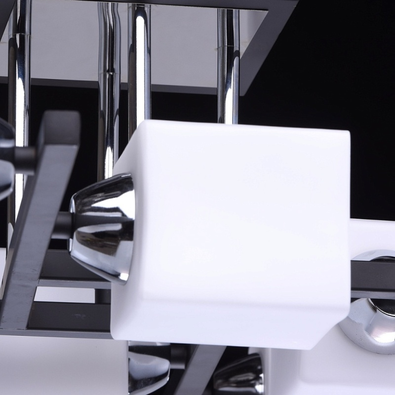 Основание светильника выполнено из сплава металла, основание и рожки окрашены в черный цвет, штанги гальванизированы в цвет хрома. Светильник декорирован плафонами квадратной формы, выполненными из двойного стекла. Внутреннее стекло окрашено в белый цвет, внешнее – прозрачное, обработано по технологии пескоструйного матирования.