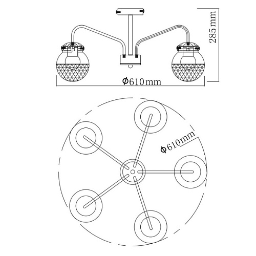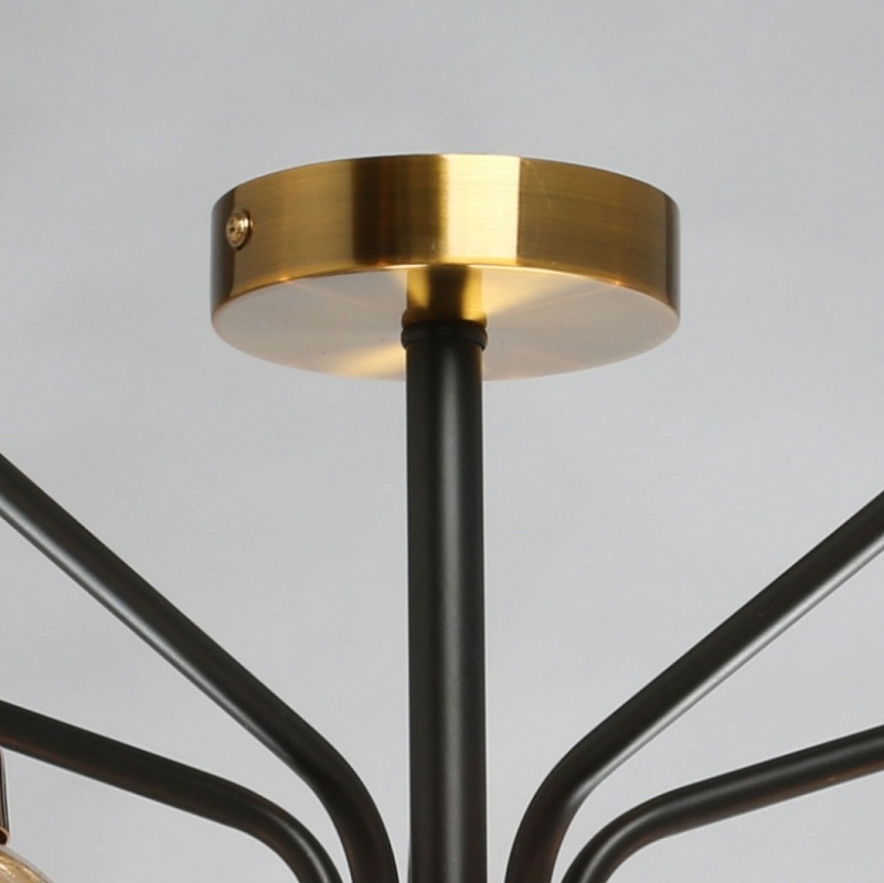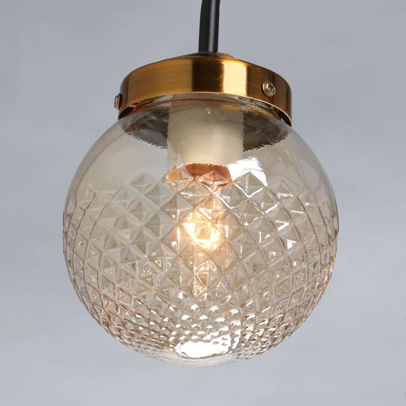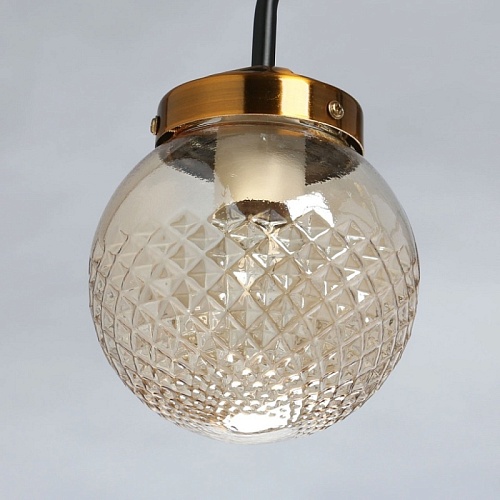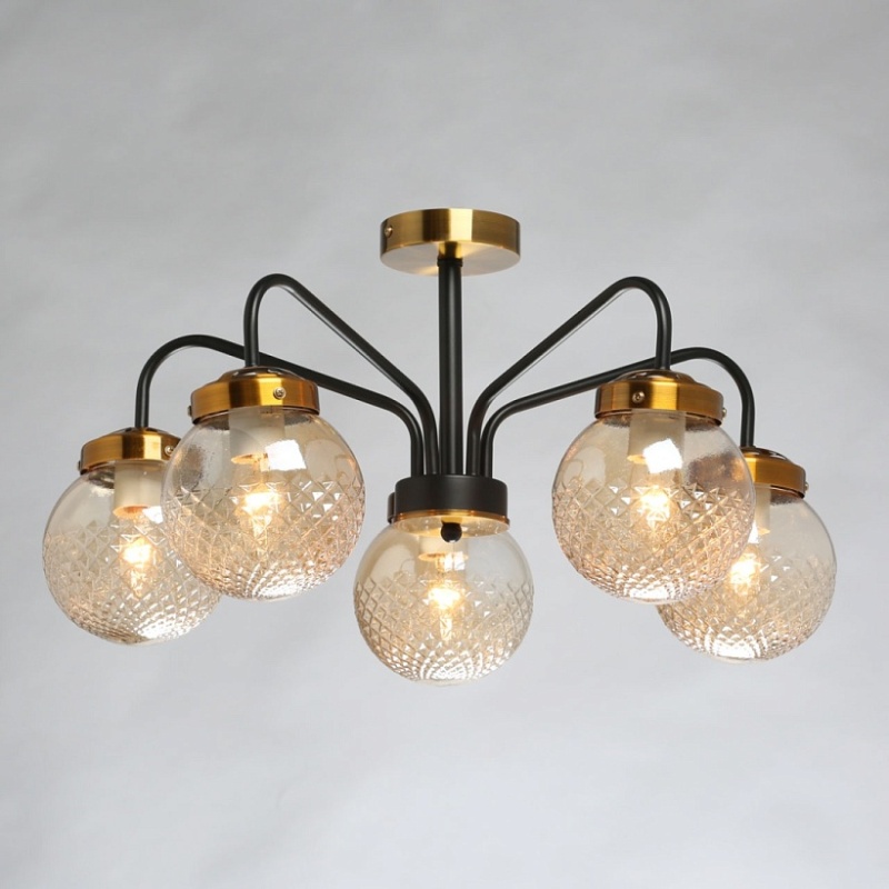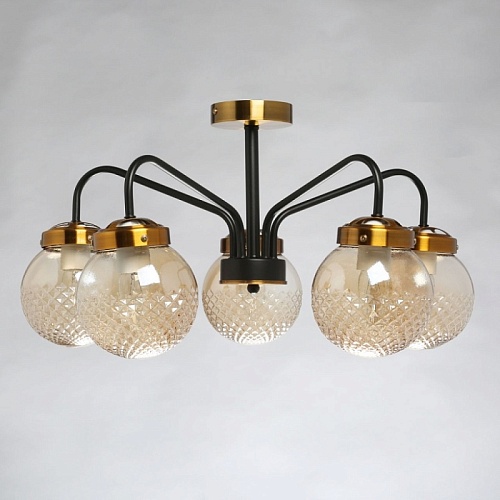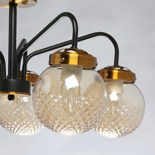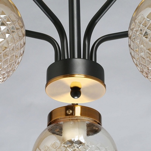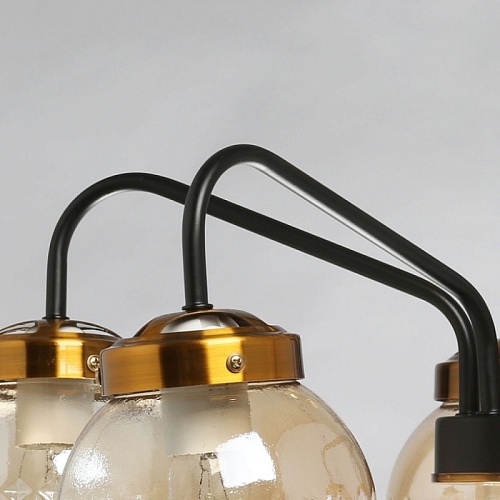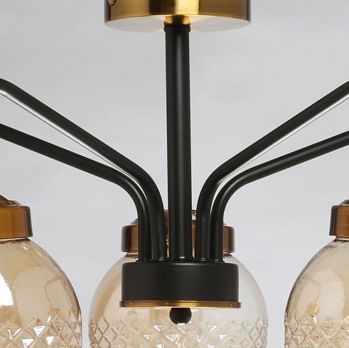 Основание светильника выполнено из металла. Потолочная чаша и держатели плафонов гальванизированы в цвет бронзы, рожки окрашены в черный цвет. Стеклянные плафоны отлиты в сложную фактурную форму и гальванизированы в цвет коньяк
