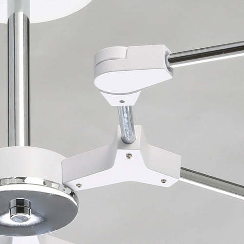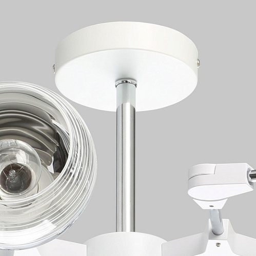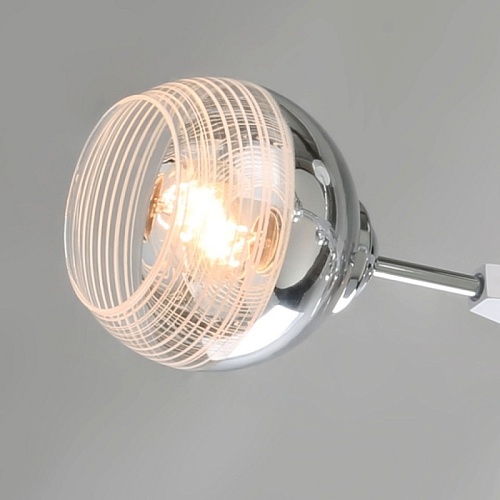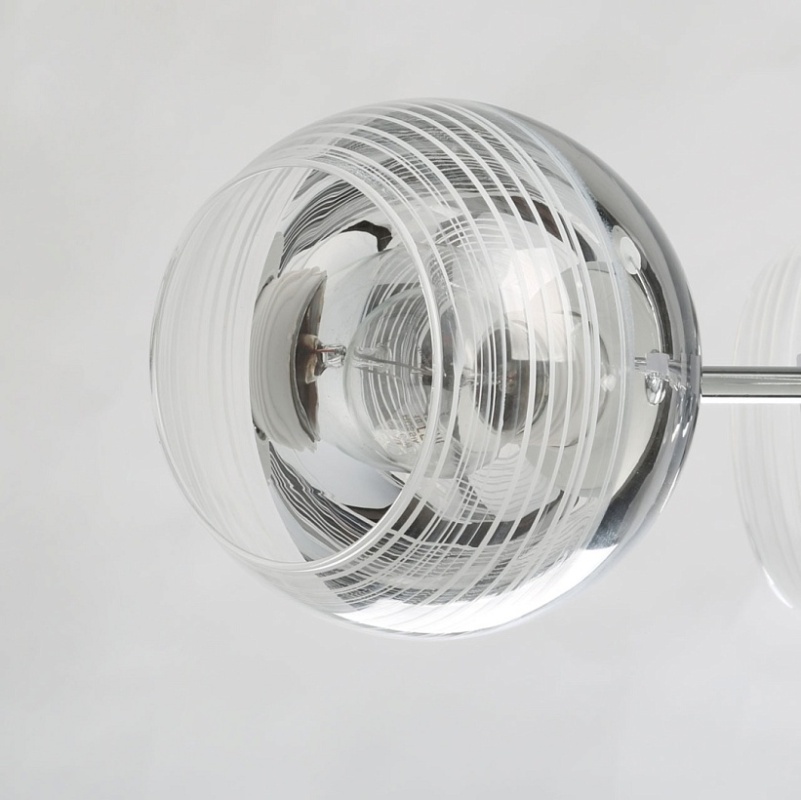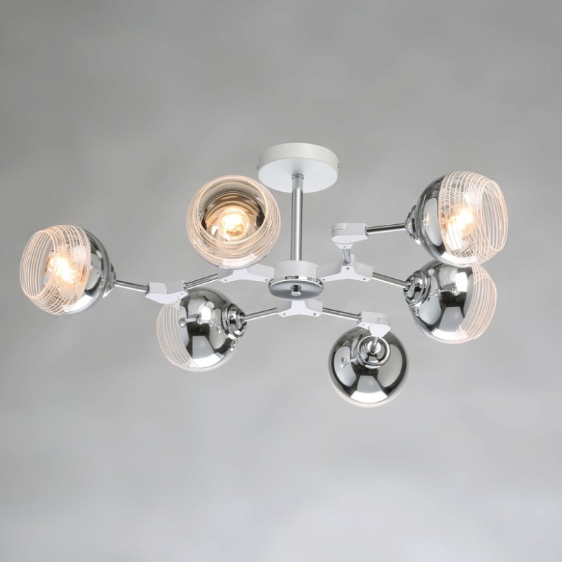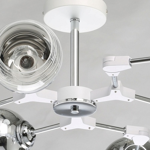 Металлическое основание потолочного светильника гальванизировано в цвет хрома. Отдельные элементы окрашены в белый цвет. Светильник декорирован прозрачными стеклянными плафонами, гальванизированными в цвет хрома у основания. На плафоны нанесен рисунок белой краской в виде параллельных полос