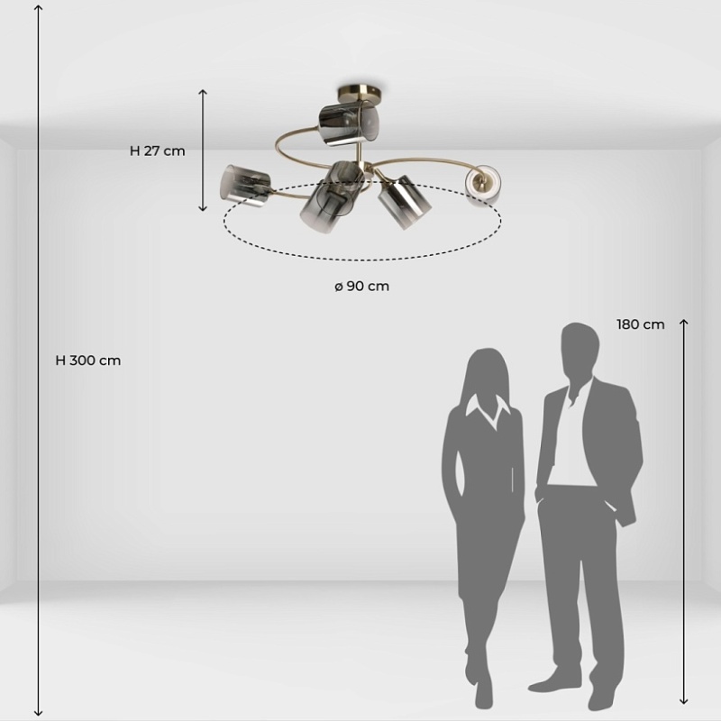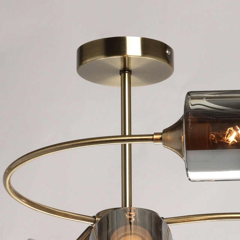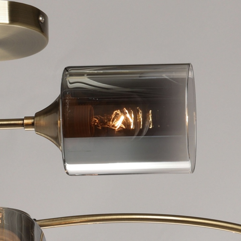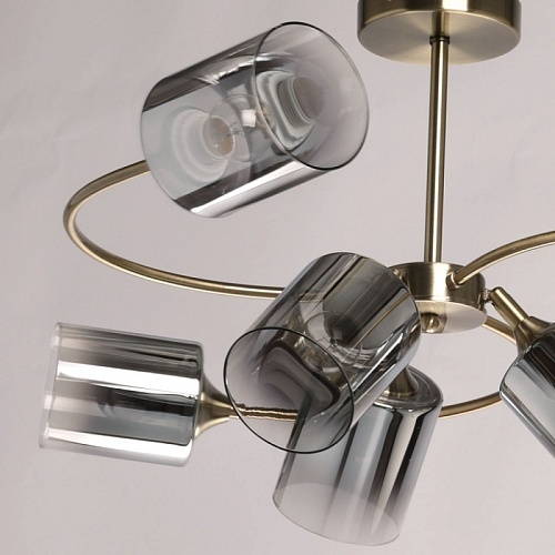 Металлическое основание потолочной люстры гальванизировано в цвет античной бронзы. Люстра декорирована стеклянными плафонами вытянутой формы, гальванизированными в дымчатый цвет.