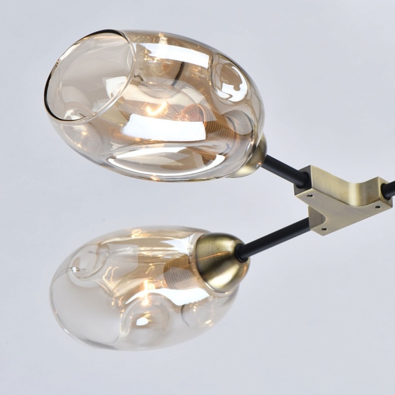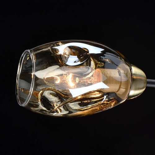 Основание светильника выполнено из металла и окрашено в черный цвет. Отдельные элементы основания гальванизированы в цвет латуни. Стеклянные плафоны отлиты в сложную форму и гальванизированы.