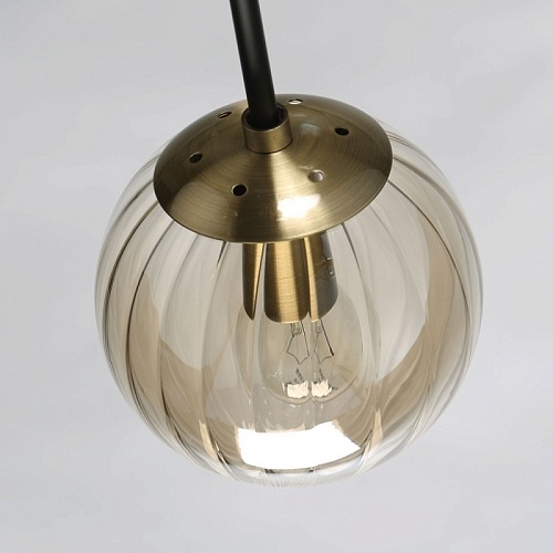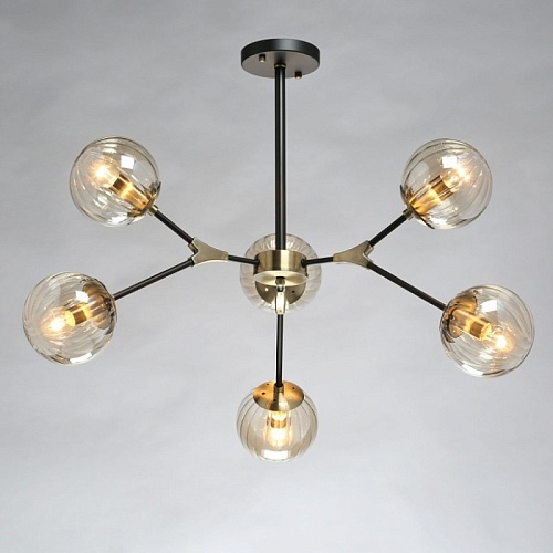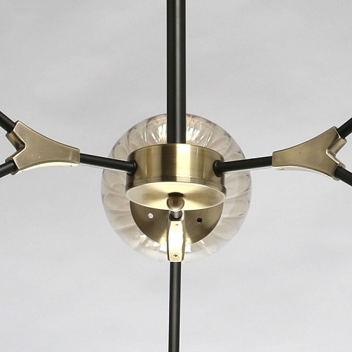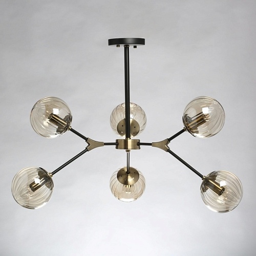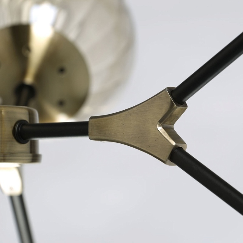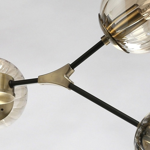 Основание светильника выполнено из металла и окрашено в черный цвет. Корпус светильника, держатели плафонов и соединения на рожках гальванизированы в цвет бронзы. Светильник декорирован стеклянными плафонами сложной формы, плафоны гладкие снаружи и рифленые изнутри. Плафоны гальванизированы в золотистый цвет. Светильник отличается оригинальным креплением плафонов.