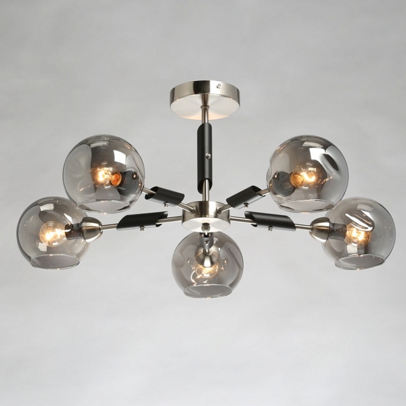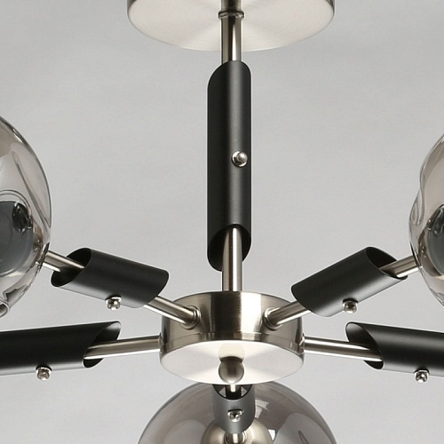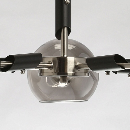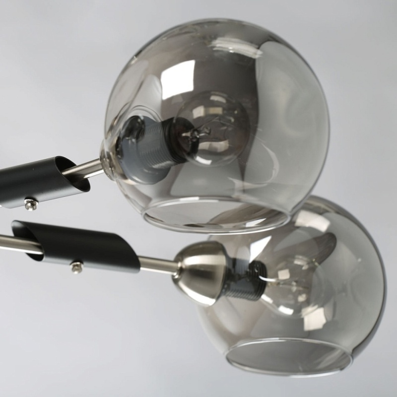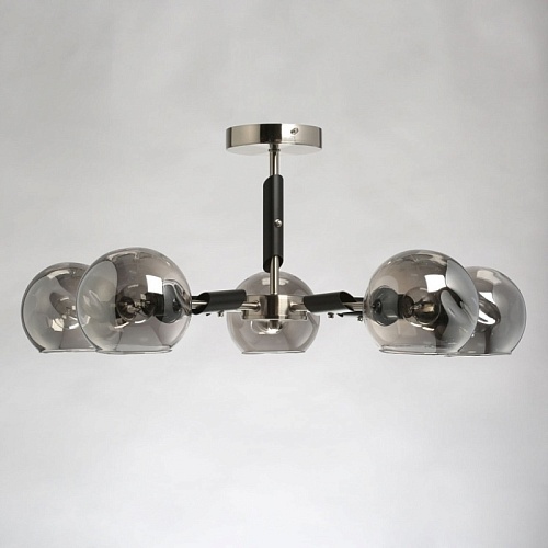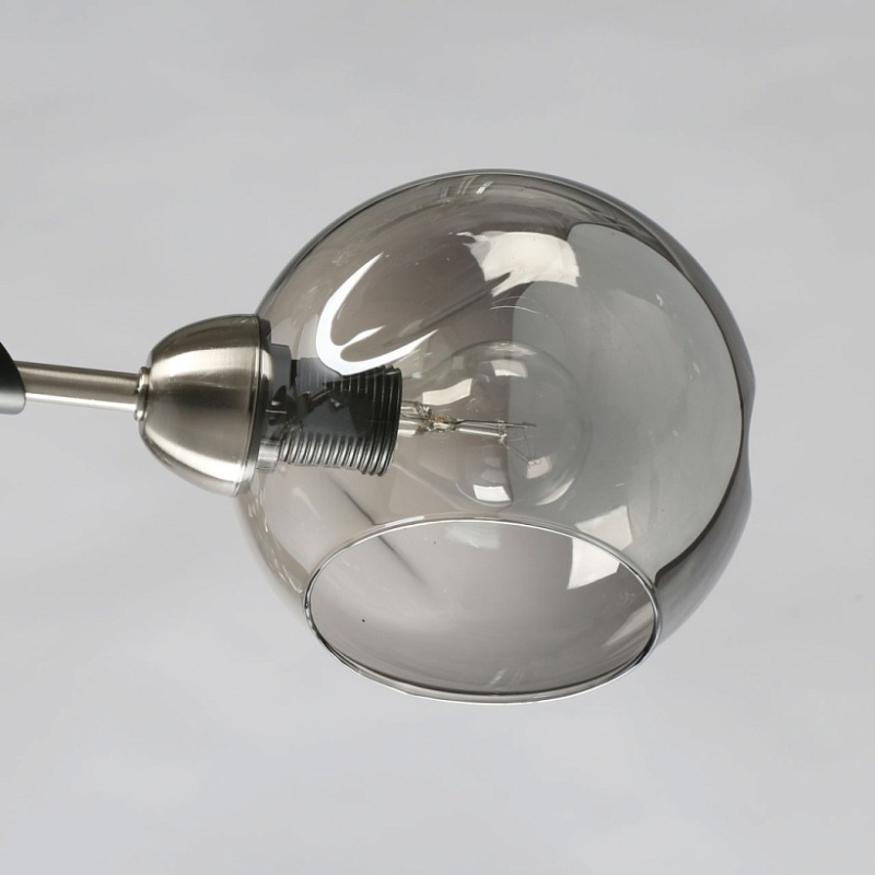 Основание светильника выполнено из металла и гальванизировано в цвет хрома с последующим матированием. Декоративные элементы на рожках окрашены в черный цвет. Светильник декорирован стеклянными плафонами, отлитыми в сложную форму и гальванизированными в дымчатый цвет.