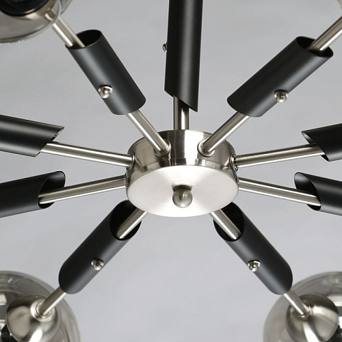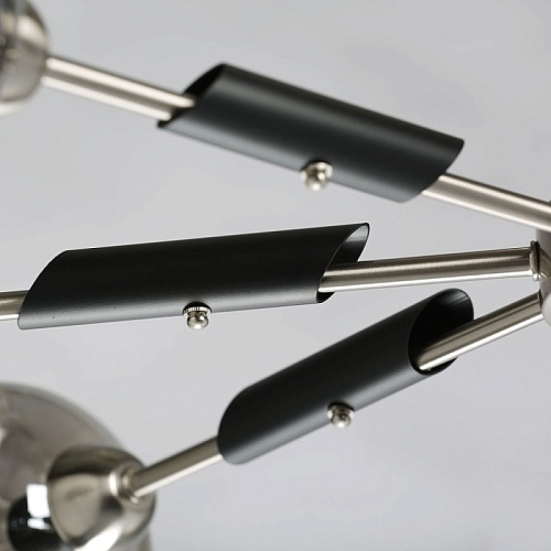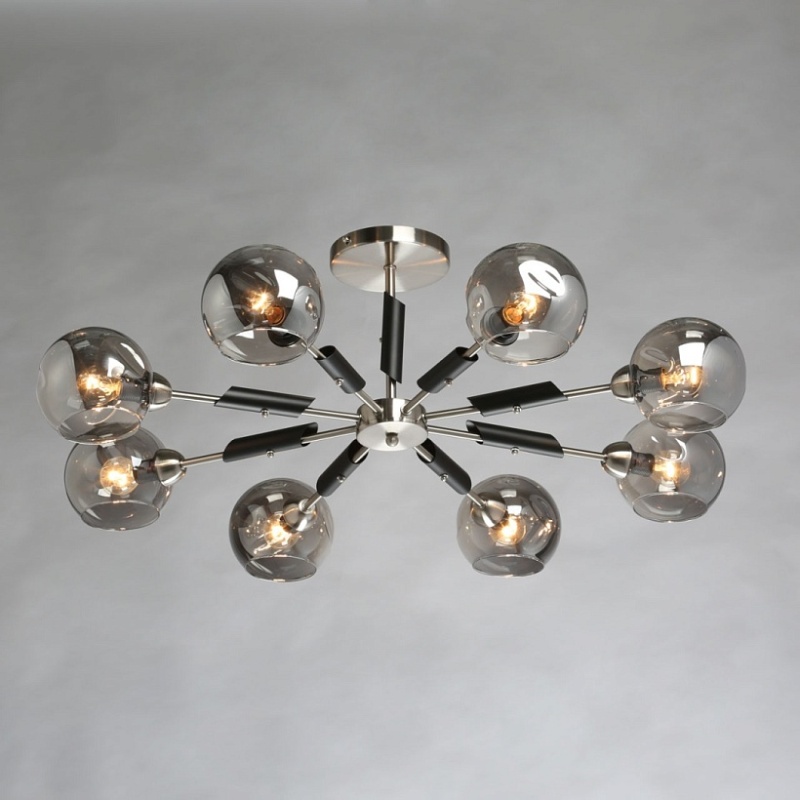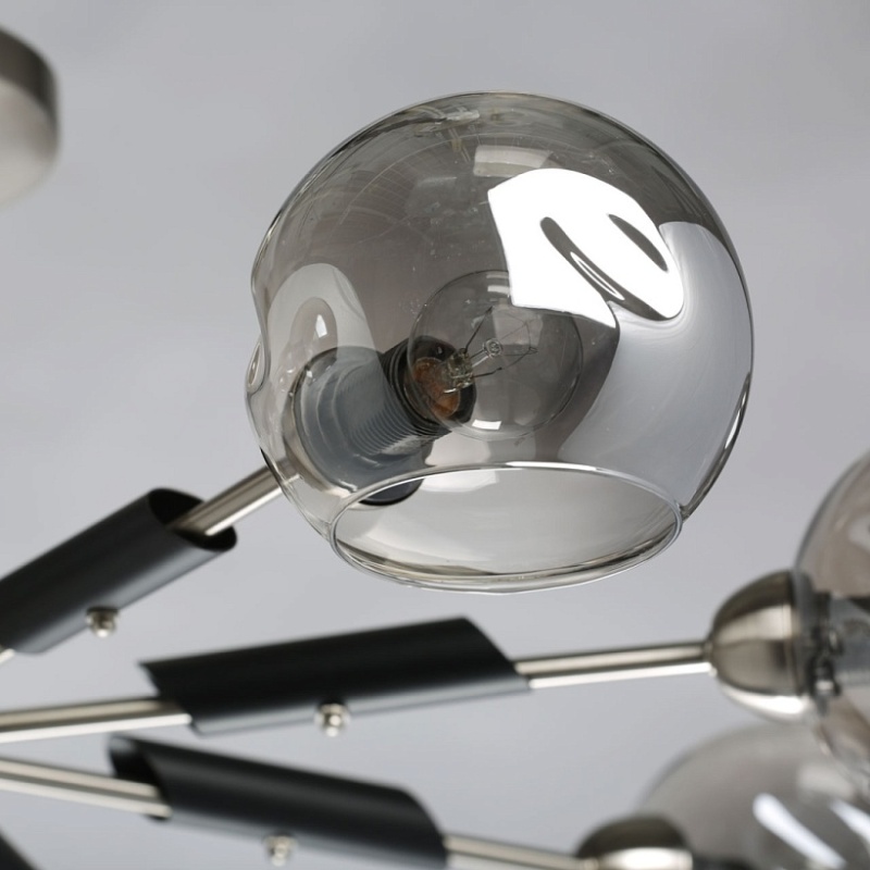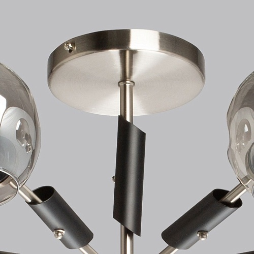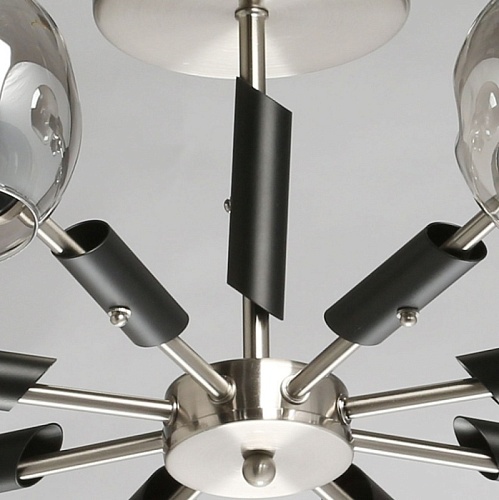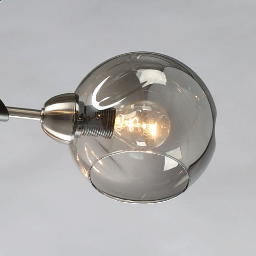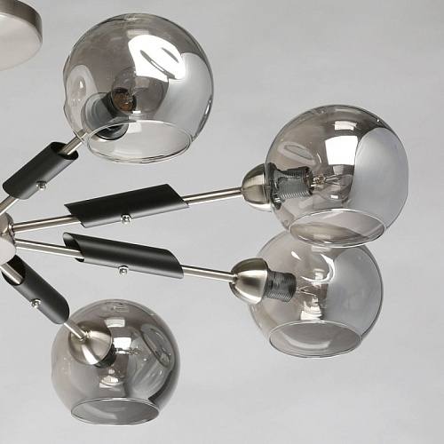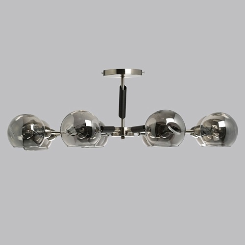 Основание светильника выполнено из металла и гальванизировано в цвет хрома с последующим матированием. Декоративные элементы на рожках окрашены в черный цвет. Светильник декорирован стеклянными плафонами, отлитыми в сложную форму и гальванизированными в дымчатый цвет.