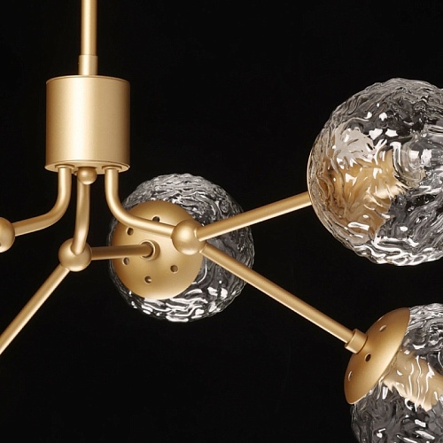 Металлическое основание люстры окрашено в цвет перламутрового золота. Источники света закрыты плафонами из прозрачного фактурного стекла.