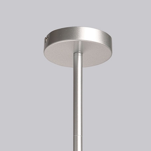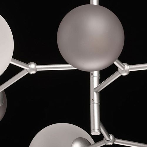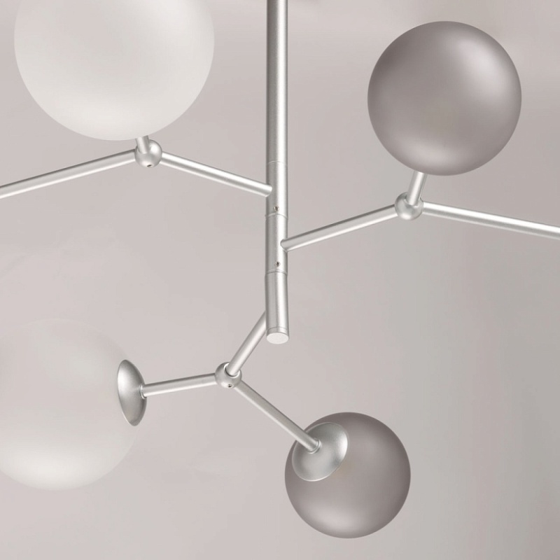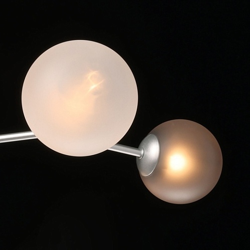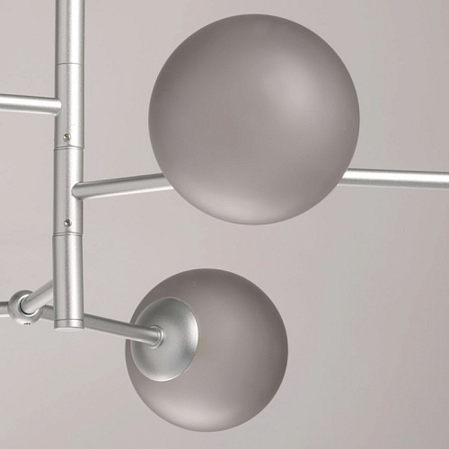 Металлическое основание люстры окрашено в цвет перламутрового серебра. Источники света закрыты стеклянными плафонами белого и дымчатого цвета.