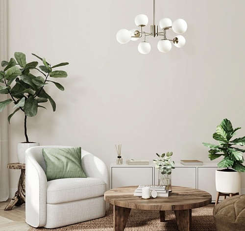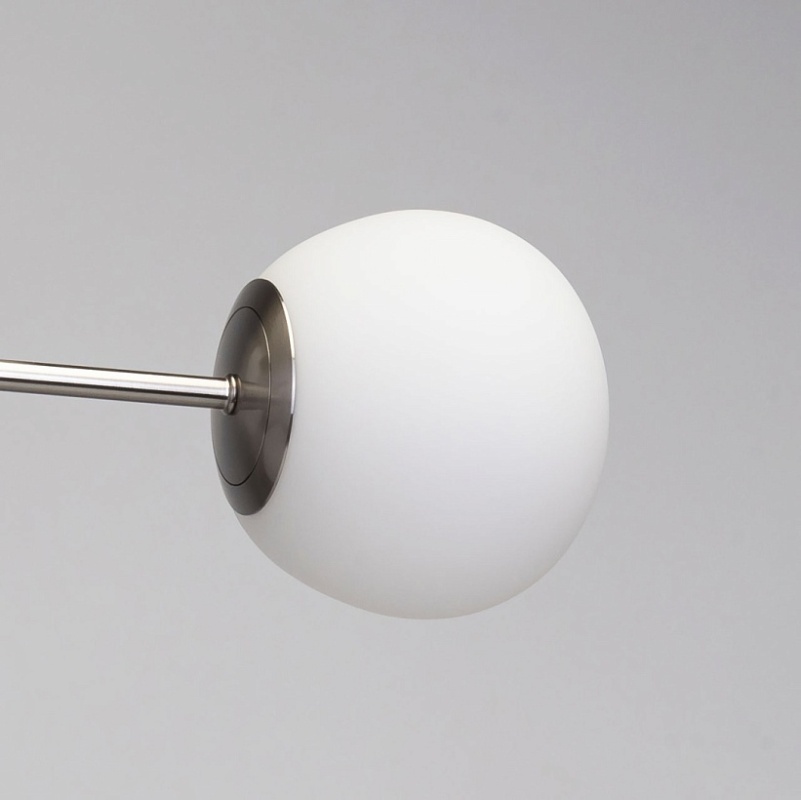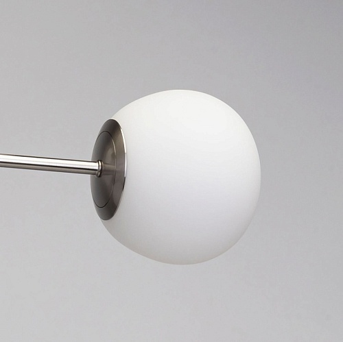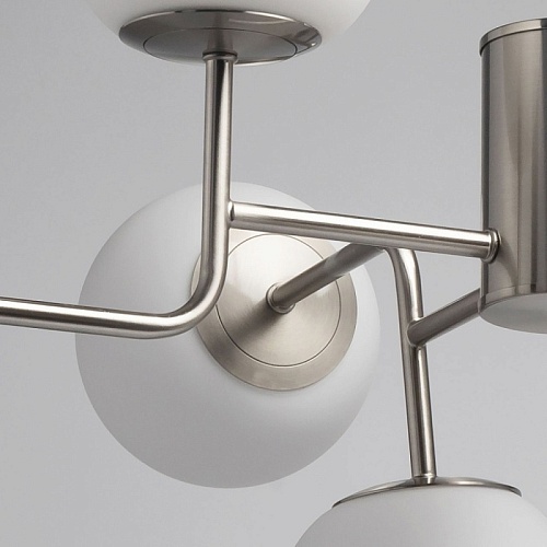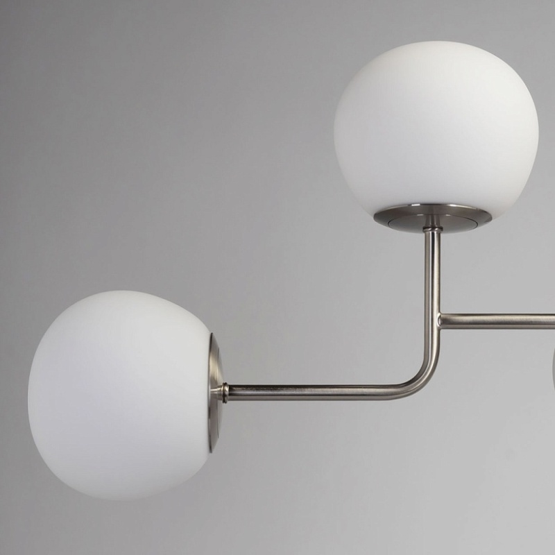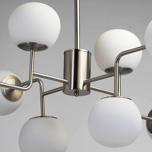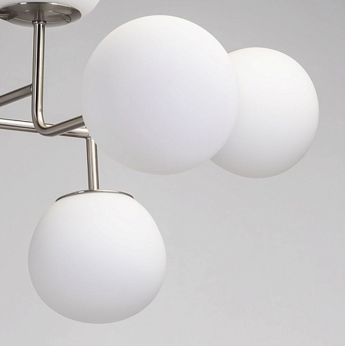 Металлическое основание потолочной люстры гальванизировано в цвет никеля и матировано. Люстра декорирована плафонами из белого матового стекла округлой формы.