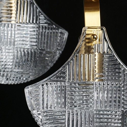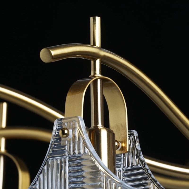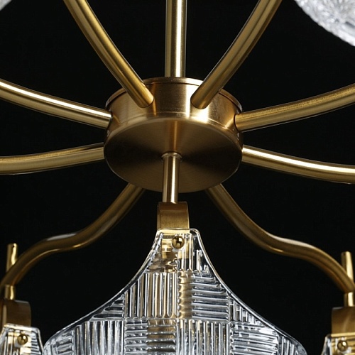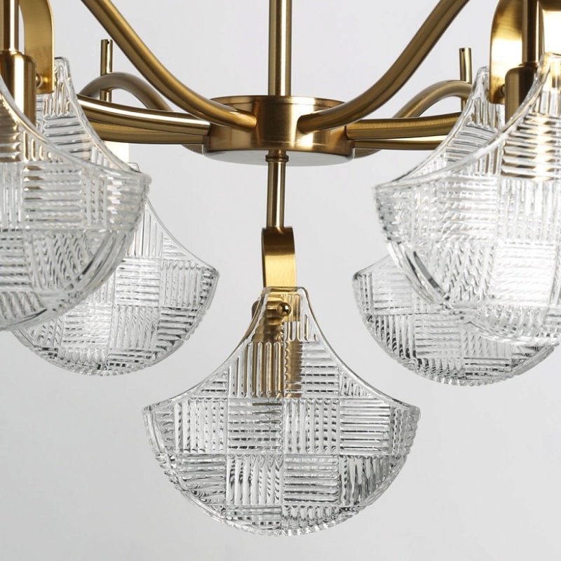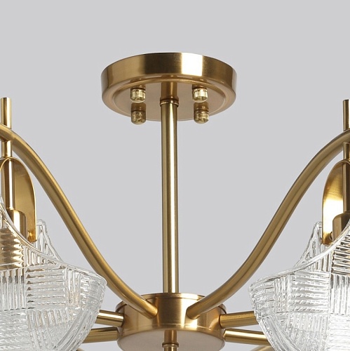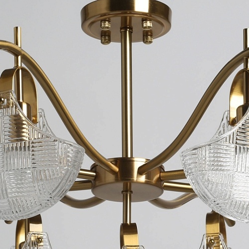 Металлическое основание потолочной люстры гальванизировано в цвет бронзы. Потолочный светильник декорирован плафонами оригинальной формы из прозрачного фактурного стекла, отлитого в сложную форму.