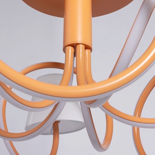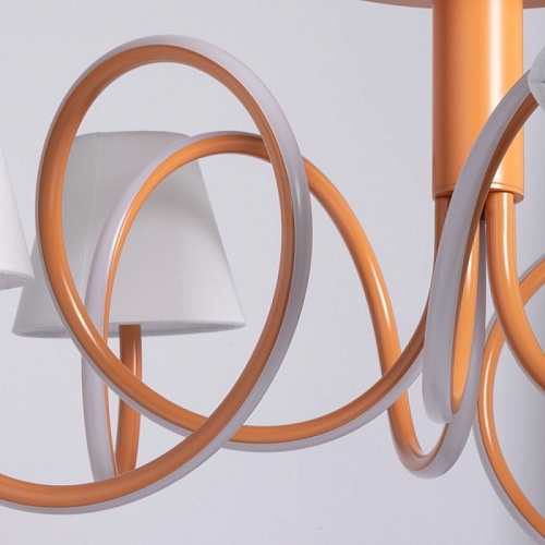 Металлическое основание потолочной люстры окрашено в терракотовый цвет. Корпус плафонов изогнутой формы выполнен из сплава алюминия с цинком и окрашен в цвет основания. Двухслойные абажуры состоят из текстиля белого цвета и термостойкого акрила с внутренней стороны. Абажуры прошиты. Светодиодные источники света закрыты белым силиконом.