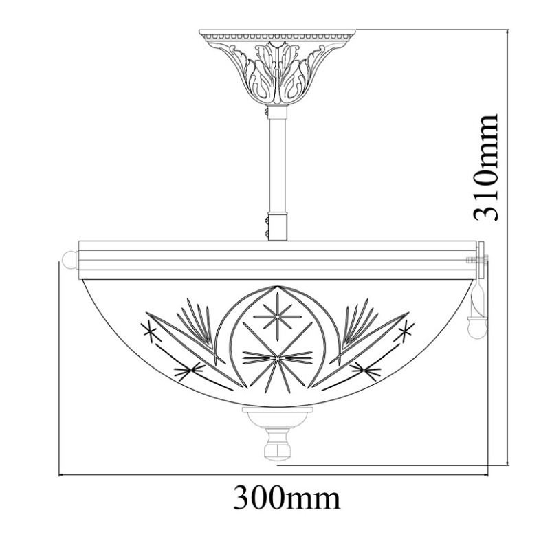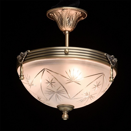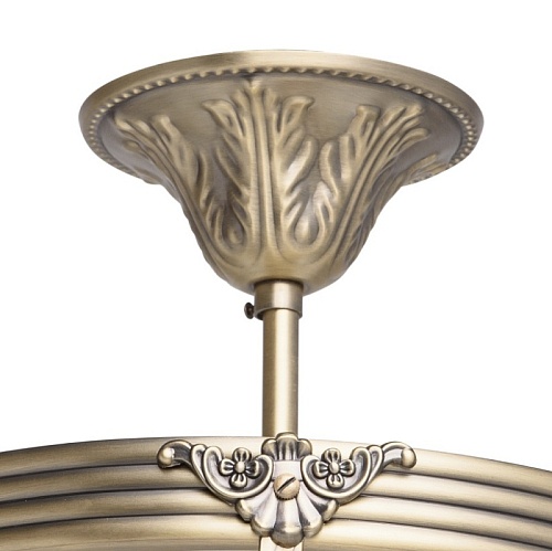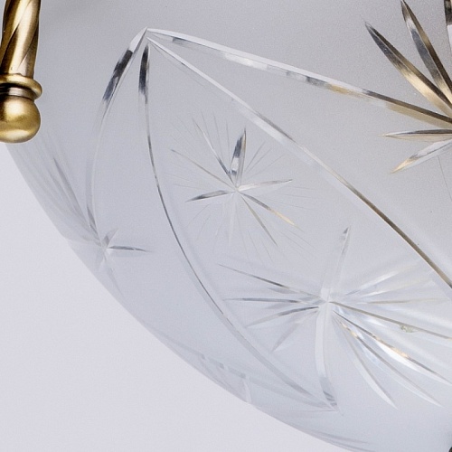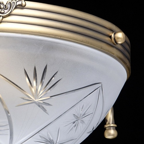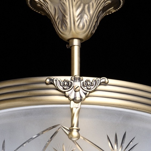 Основание выполнено из сплава железа по технологии токарной обработки. Каркас плафона выполнен из сплава железа. Плафон изготовлен из прозрачного стекла, обработанного пескоструйным матированием с рисунком нанесенным по технологии алмазной резьбы, отлит на форму. Центральный плафон декорирован художественным литьем из сплава алюминия.