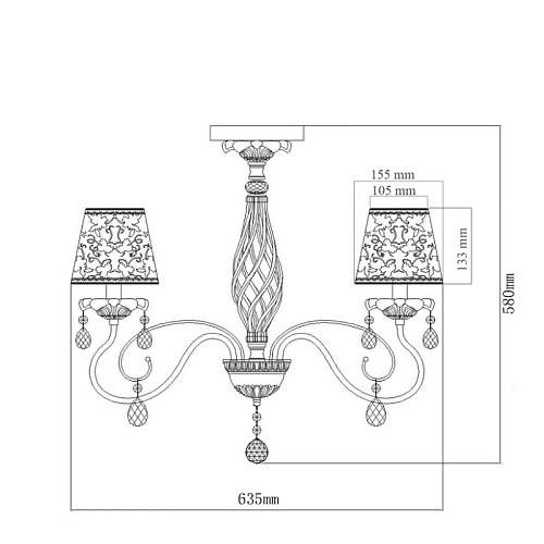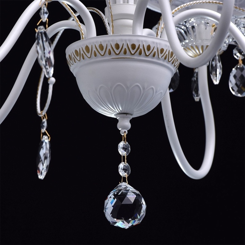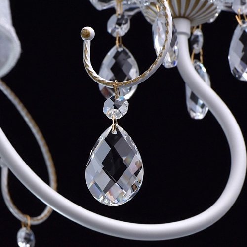 Основание: сплав металла, окрашено в белый цвет, фигурному орнаменту придан объем ручным окрашиванием кистью в цвет золота. Потолочная чаша, корпус: прессование.Центральный стержень: твист.Рожки: прокат на роликовом станке.Светильник декорирован массивом хрусталя сложной огранки, декоративными розетками из стекла, отлитого в форму и подвесками из хрусталя. Абажуры выполнены из кружева с термостойким акрилом внутри и окантованы по краям.