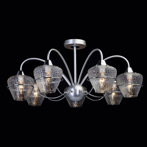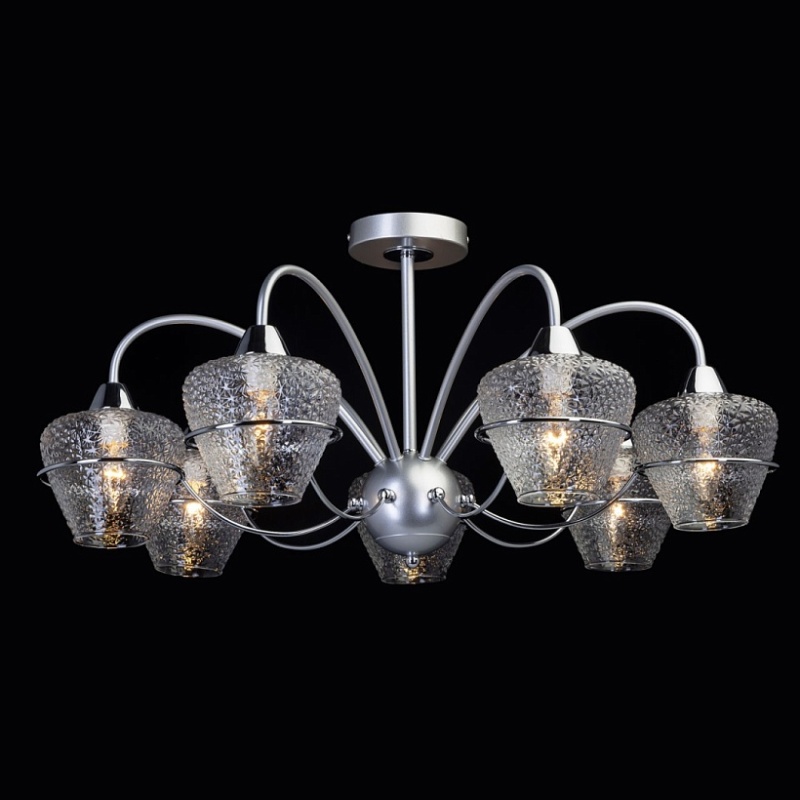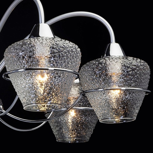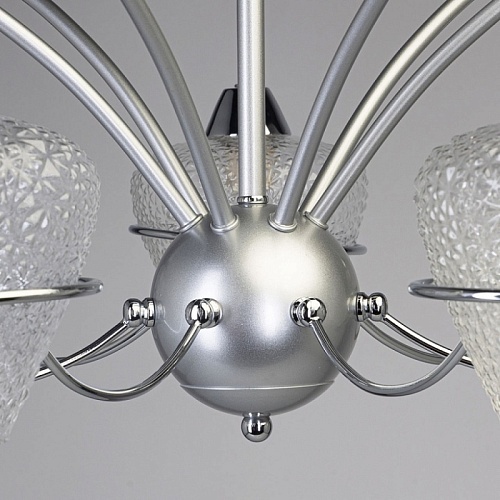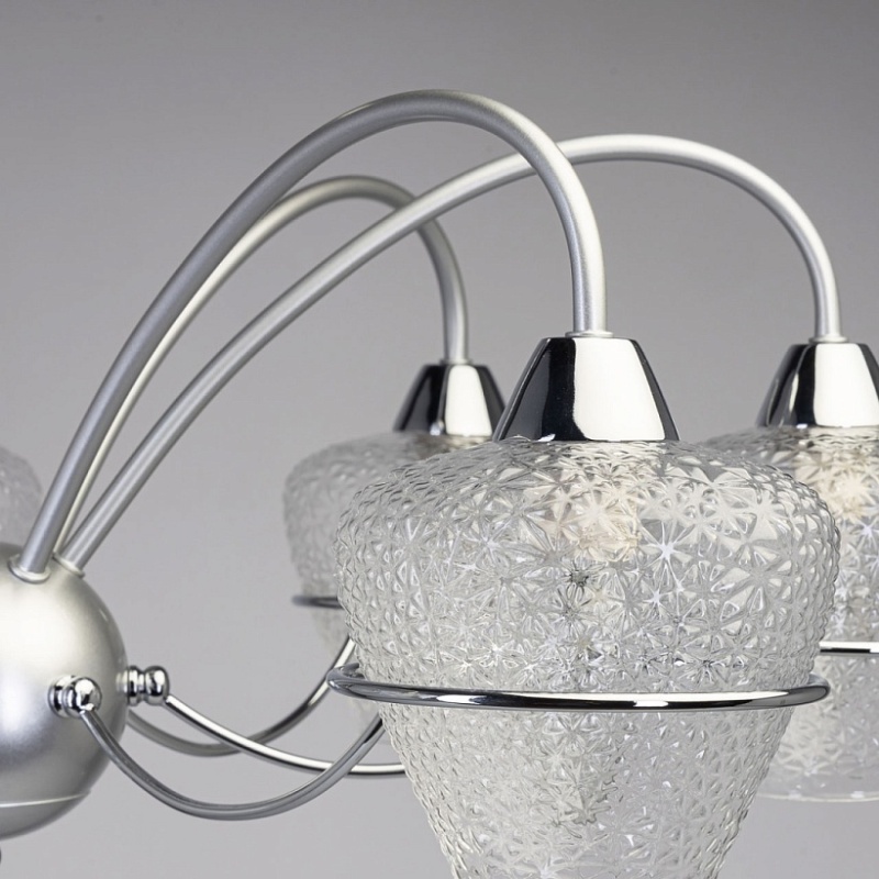 Металлическое основание потолочной люстры окрашено в цвет перламутрового серебра. Отдельные элементы основания гальванизированы в цвет хрома. Светильник декорирован плафонами из фактурного стекла.