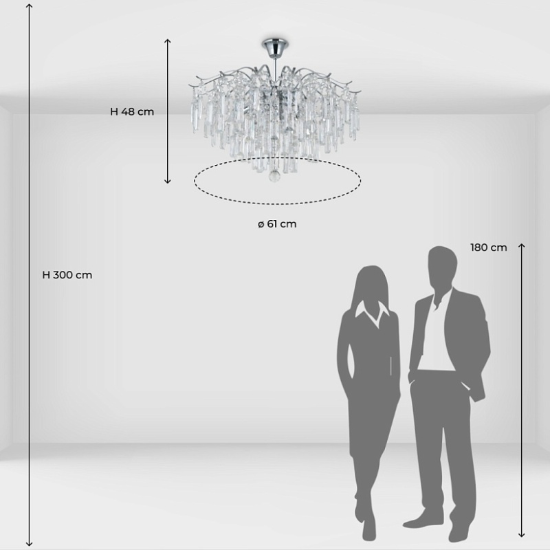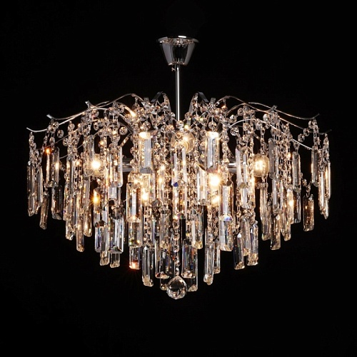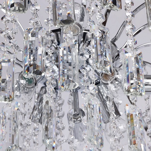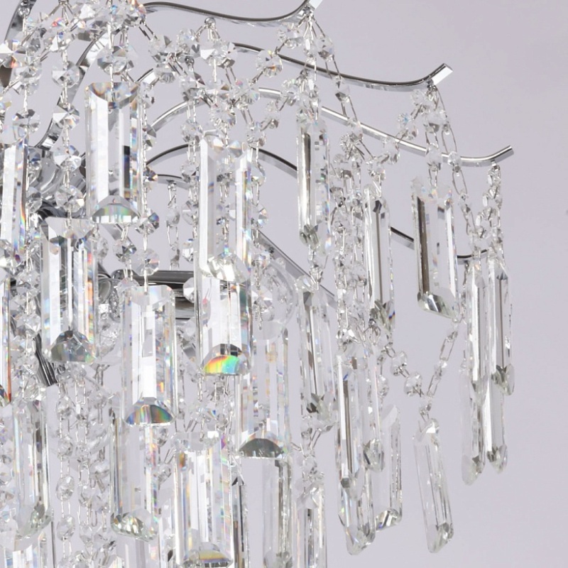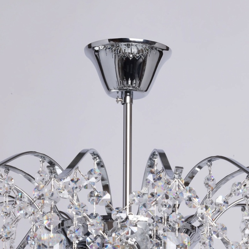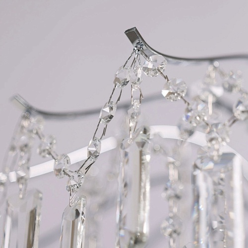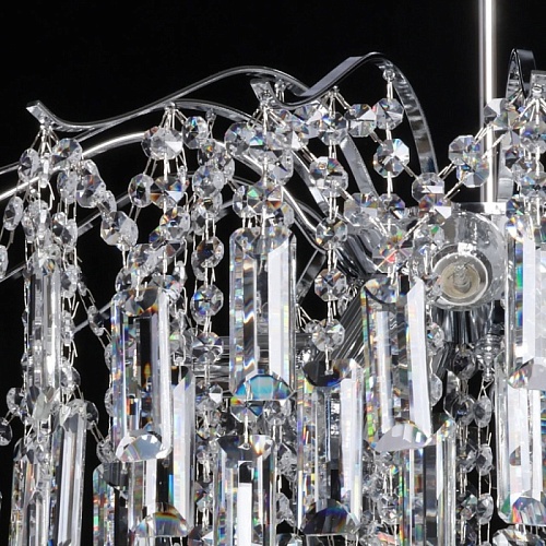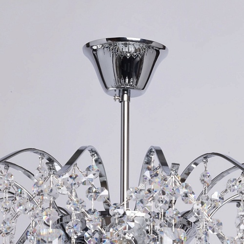 Металлическое основание потолочной люстры гальванизировано в цвет хрома. Светильник декорирован прозрачным хрусталем разной формы.