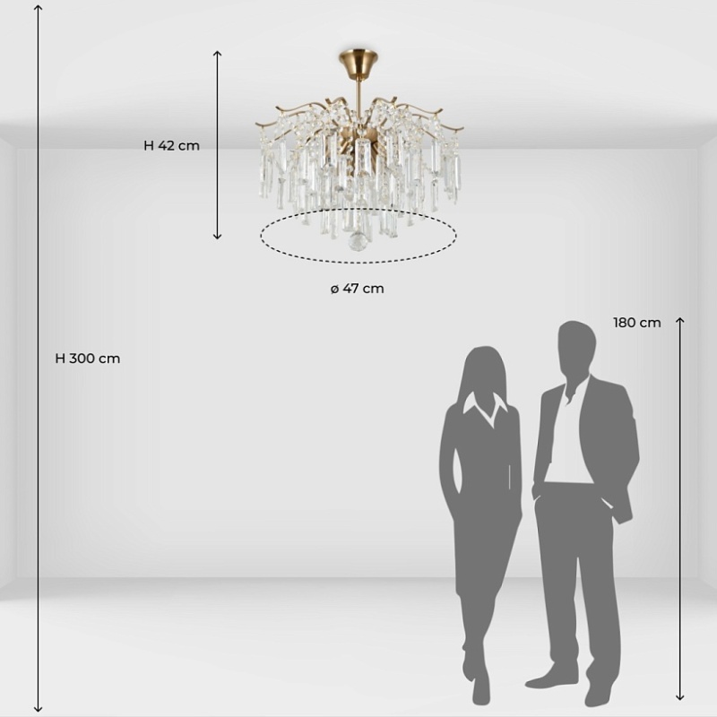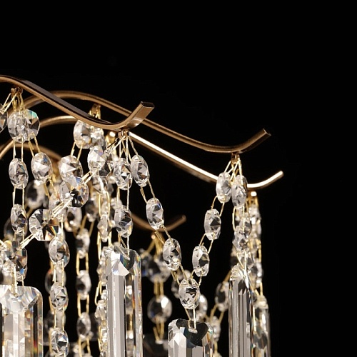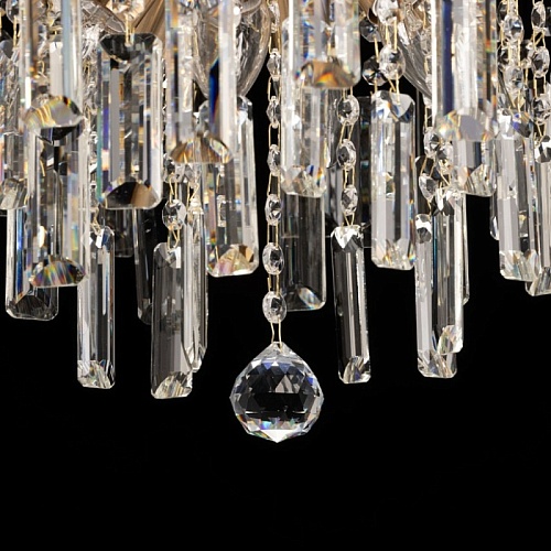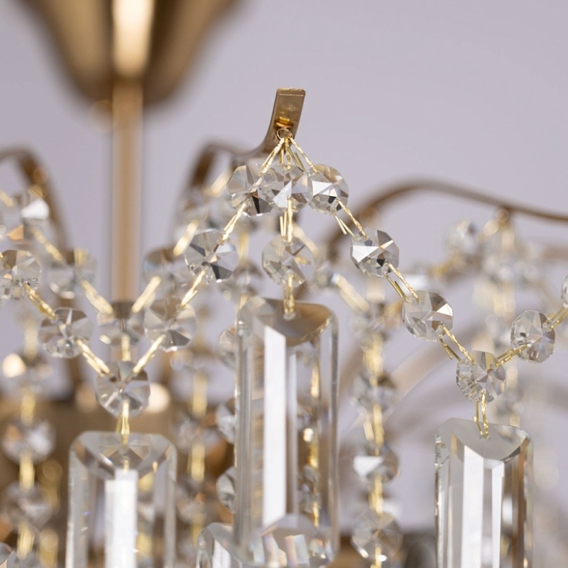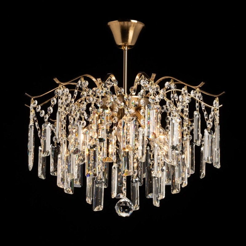 Металлическое основание потолочной люстры гальванизировано в цвет латуни. Светильник декорирован прозрачным хрусталем разной формы.