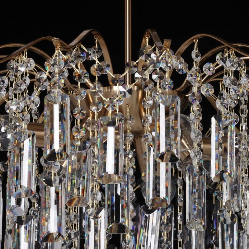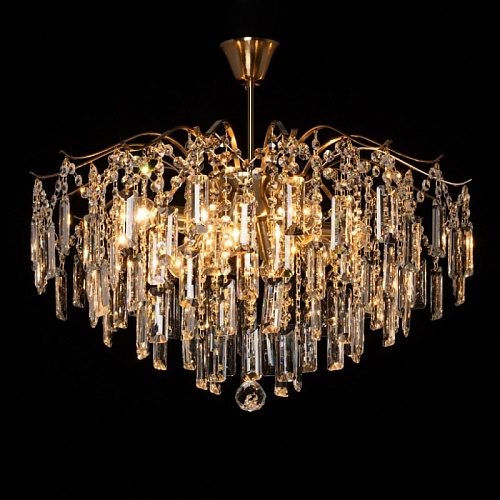 Металлическое основание потолочной люстры гальванизировано в цвет латуни. Светильник декорирован прозрачным хрусталем разной формы.