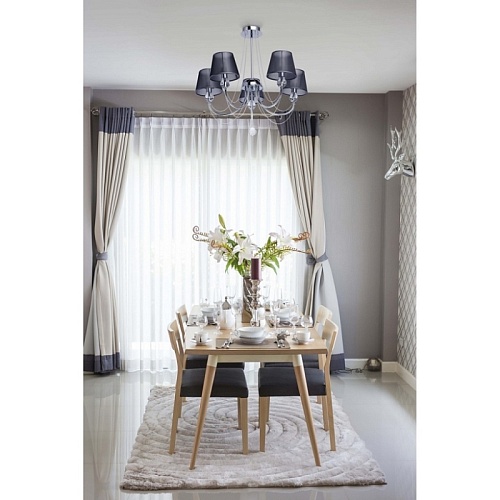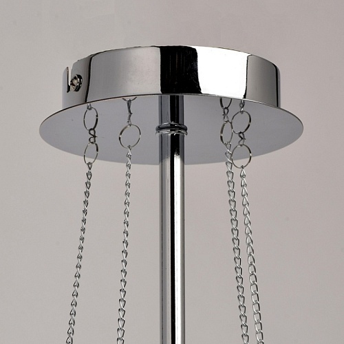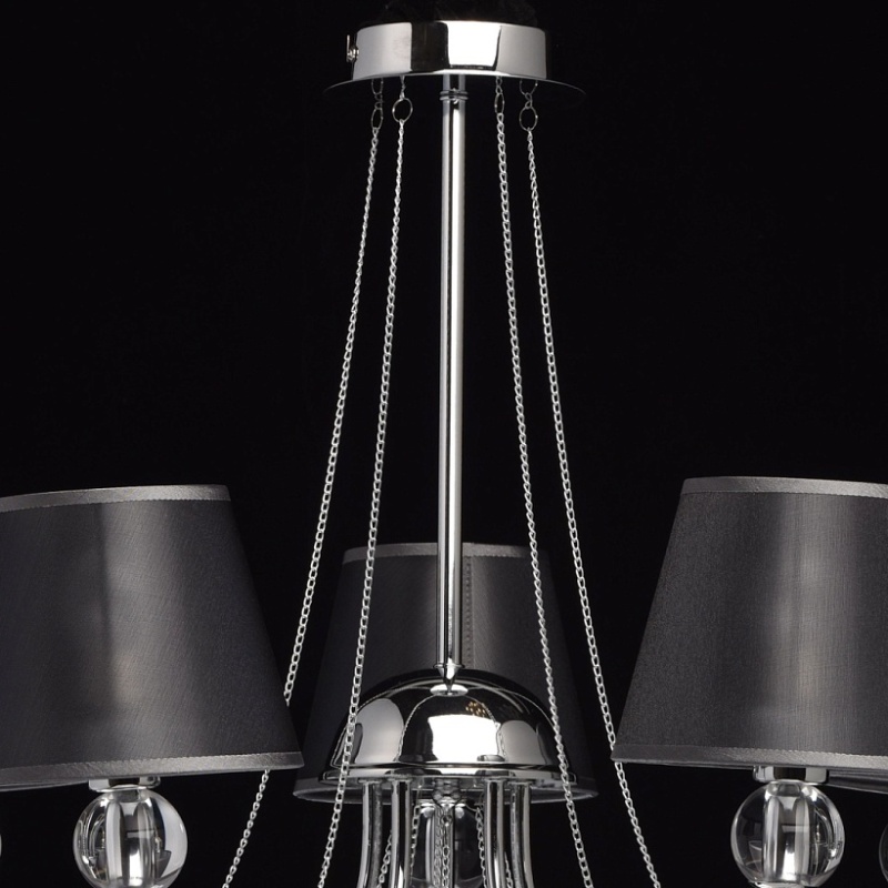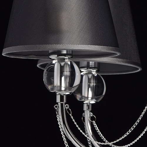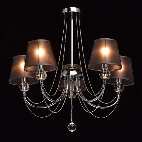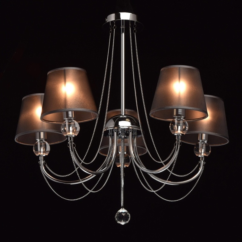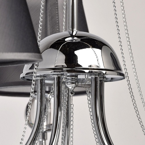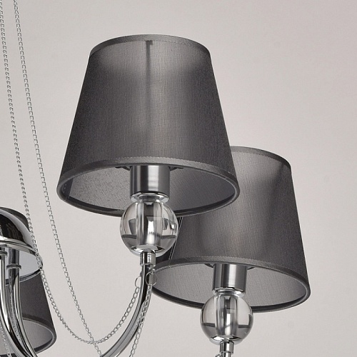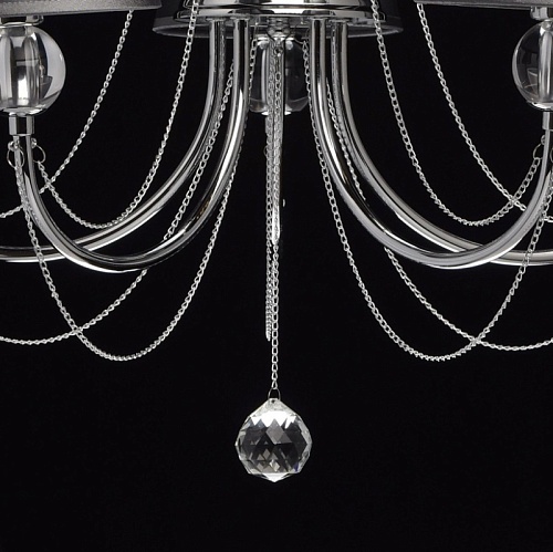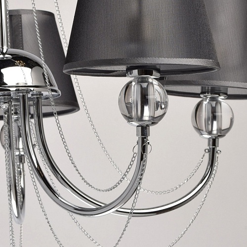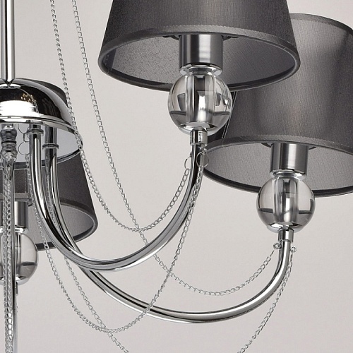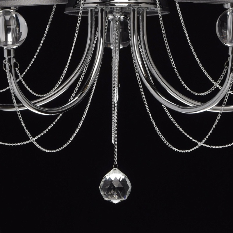 Основание светильника выполнено из металла и гальванизировано в цвет хрома. Рожки выполнены по технологии проката на роликовом станке. Розетки выполнены из прозрачного акрила в виде шара. Двойные плафоны: выполнены из органзы графитового цвета, с атласным кантом серого цвета и с термостойким акрилом с внутренней стороны, прошиты.Декор: цепочки гальванизированы в цвет арматуры, центральная подвеска декорирована прозрачным хрустальным шаром.