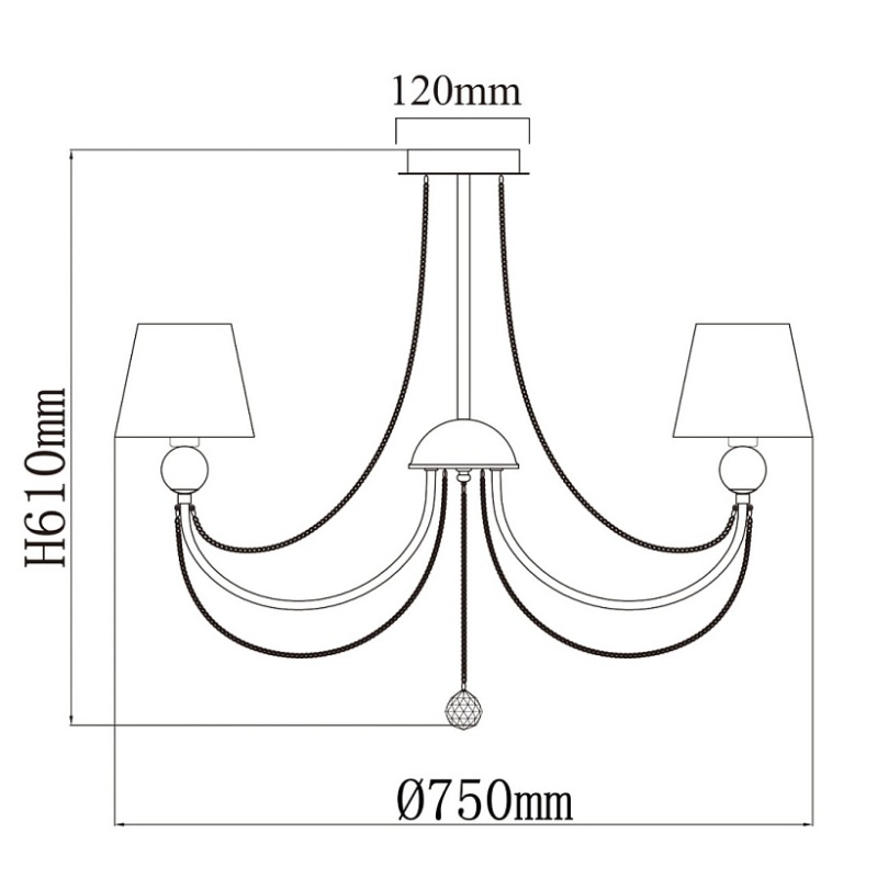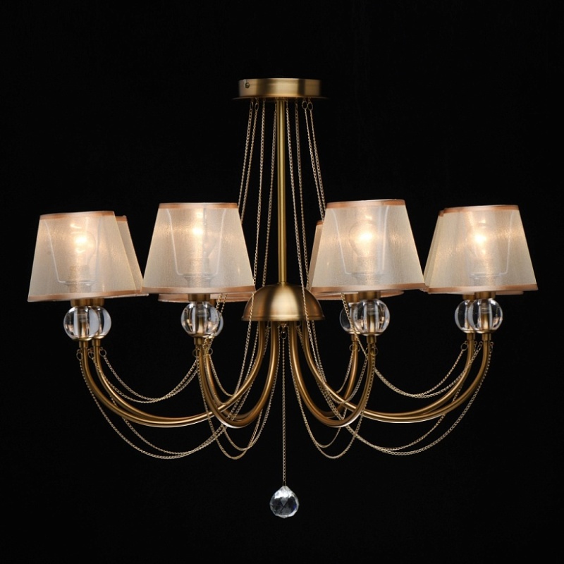Основание светильника выполнено из металла и гальванизировано в цвет золота с последующим матированием. Светильник декорирован текстильными абажурами из бежевой органзы с термостойким акрилом внутри. По краям абажуры отделаны кантом цвета золота. Рожки декорированы сферами из прозрачного акрила. Центральный подвес выполнен из хрусталя формы шар.