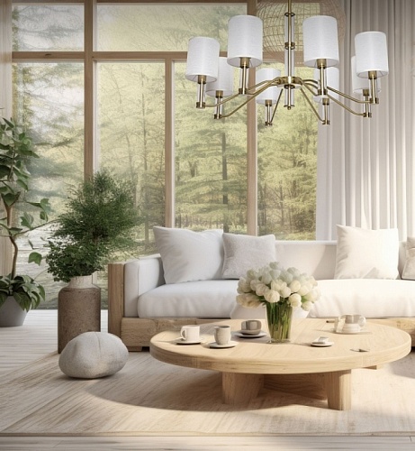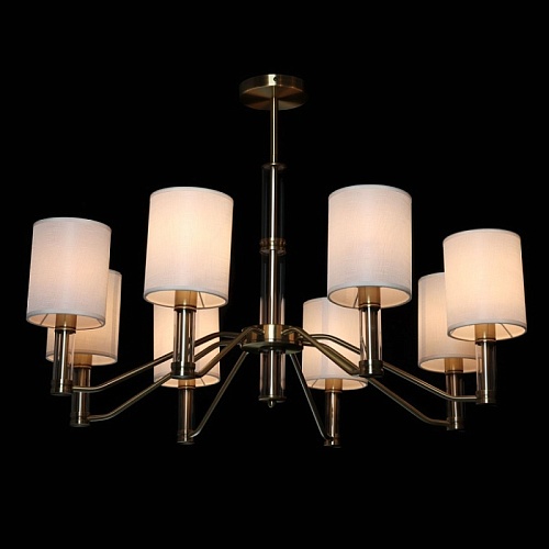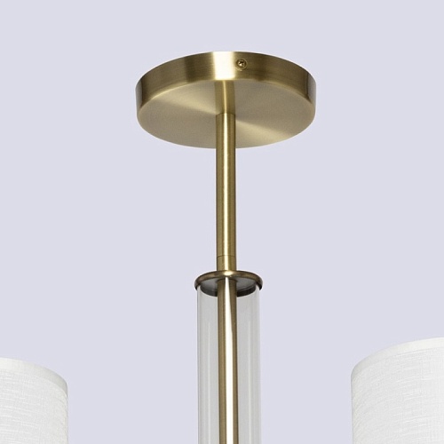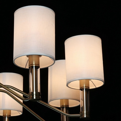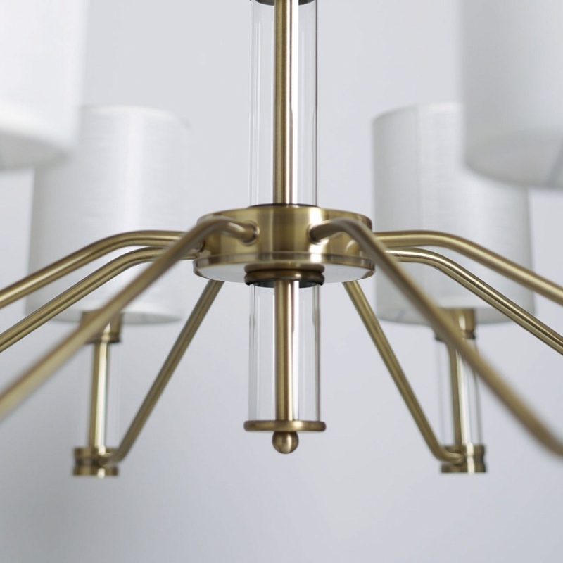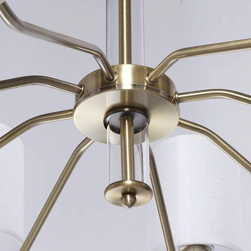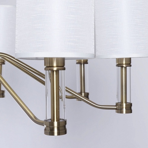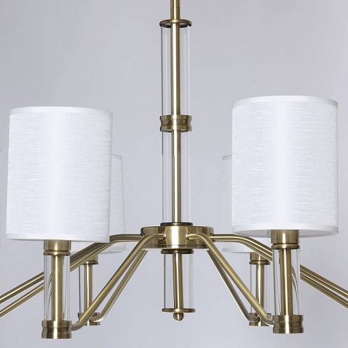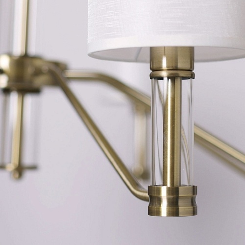 Металлическое основание подвесной люстры гальванизировано в цвет античной бронзы. Традиционные источники света закрыты двухслойными текстильными абажурами белого цвета с термостойким акрилом внутри. Абажуры отделаны кантами и прошиты. Светильник декорирован элементами из прозрачного стекла вытянутой формы.