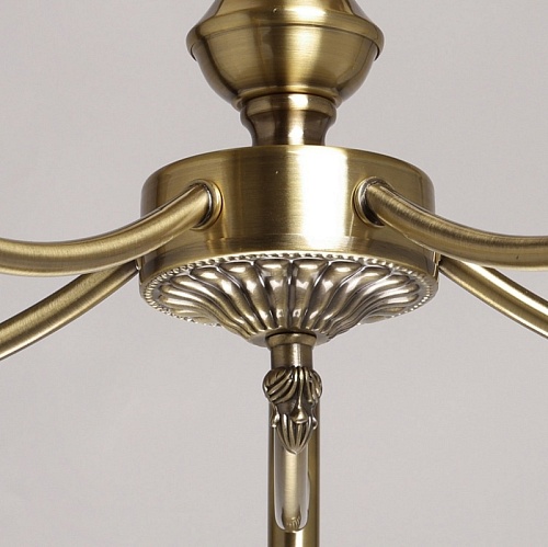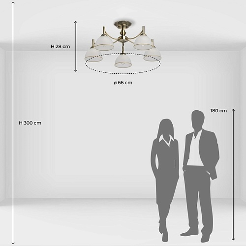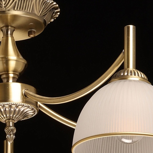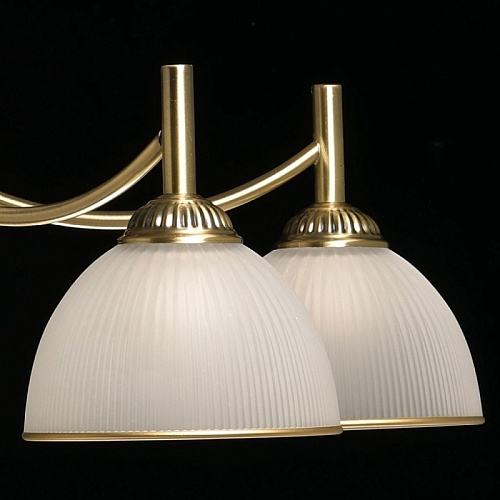 Металлическое основание потолочной люстры гальванизировано в цвет античной бронзы. Стеклянные плафоны вниз отлиты в сложную форму и матированы. Края плафонов окрашены вручную кантом золотого цвета.