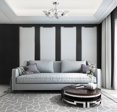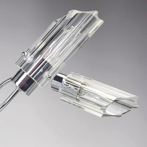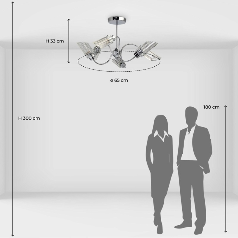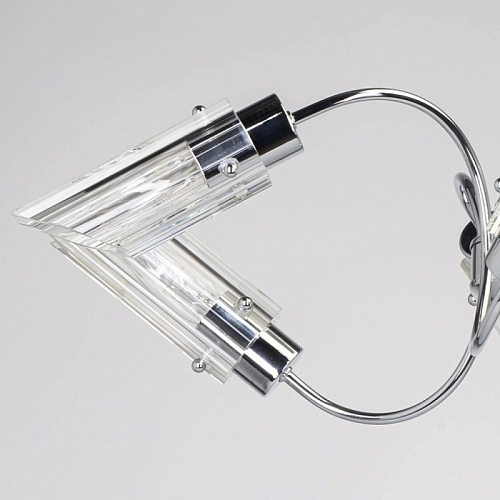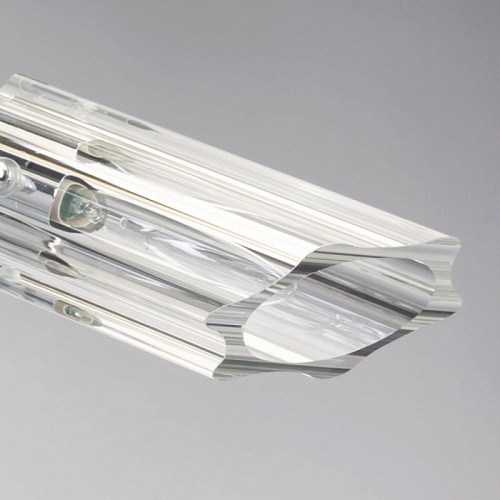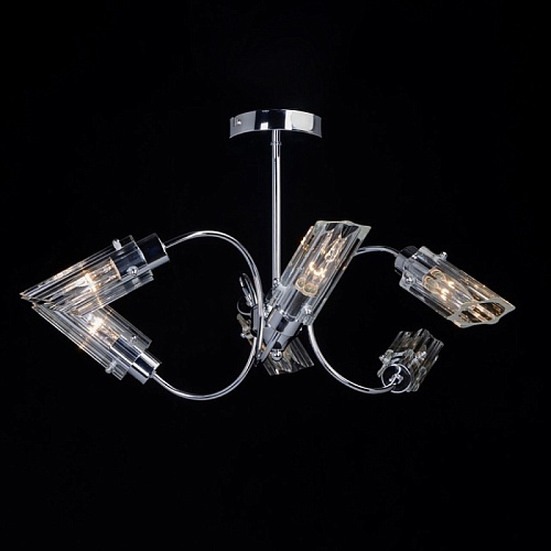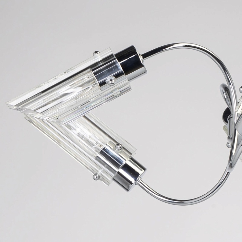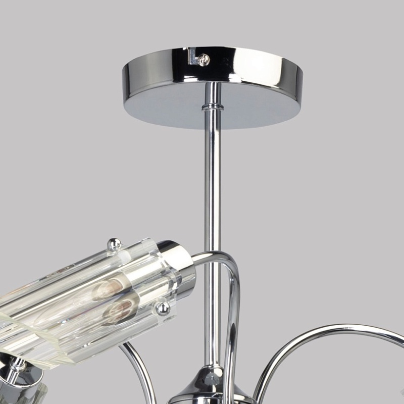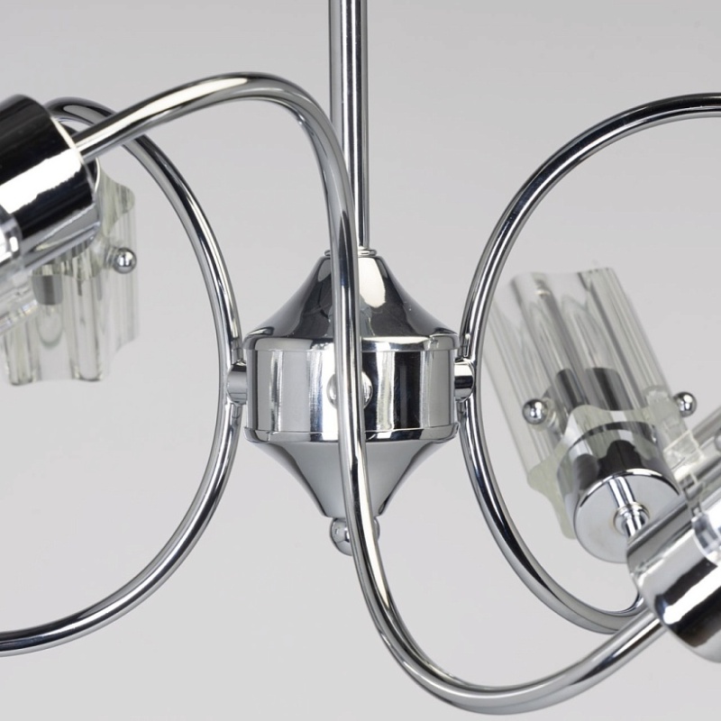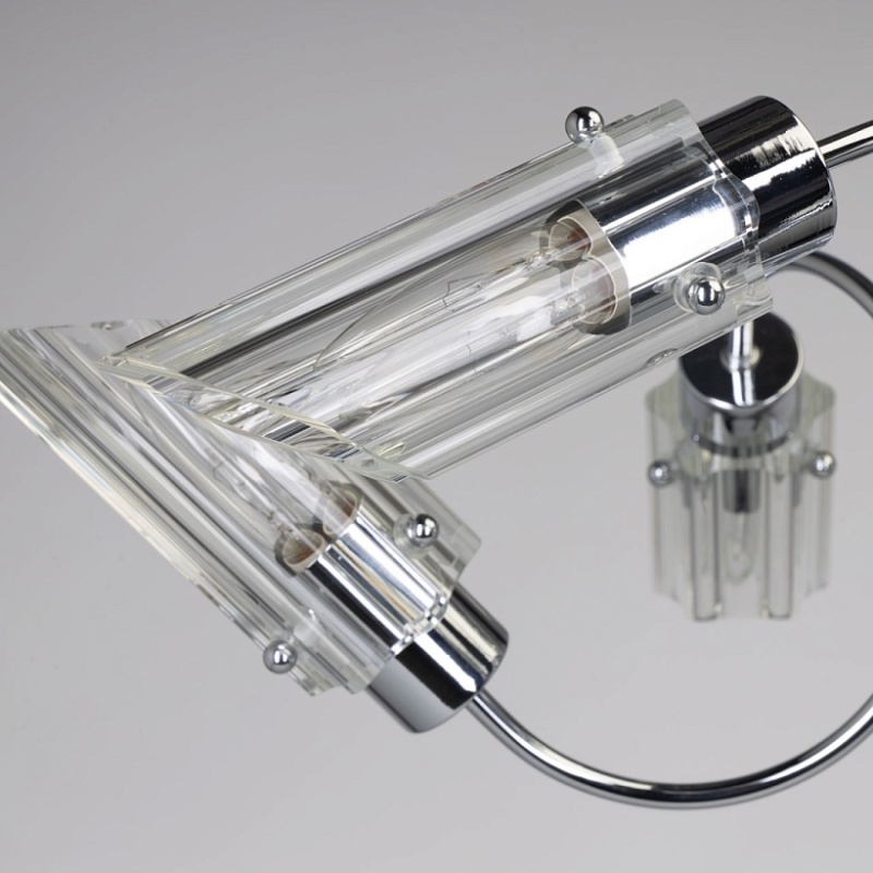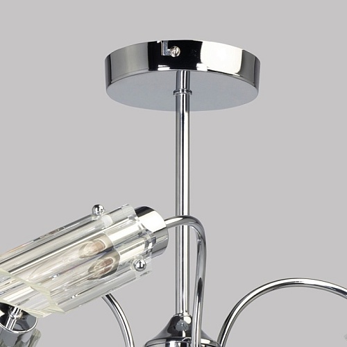 Металлическое основание потолочной люстры гальванизировано в цвет хрома. Люстра декорирована прозрачными фактурными стеклянными плафонами вытянутой формы.