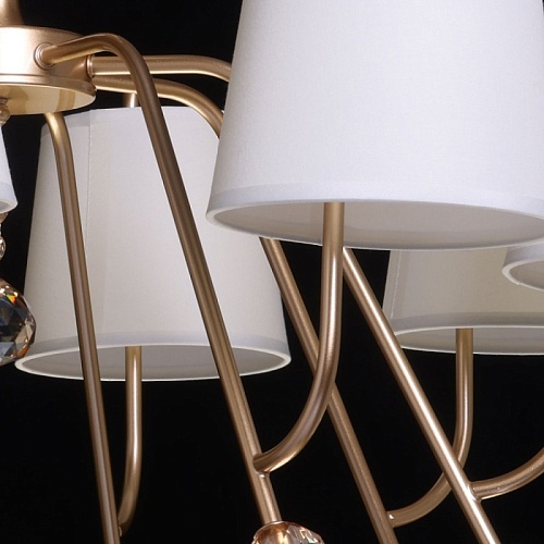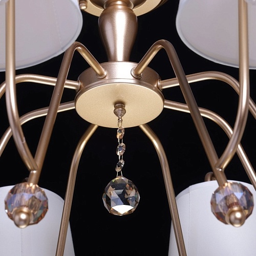Металлическое основание подвесной люстры окрашено в цвет перламутрового золота. Заменяемые источники света закрыты текстильными абажурами бежевого цвета. С внутренней стороны текстиль защищен прозрачным термостойким акрилом. Абажуры отделаны кантами и прошиты. Люстра декорирована хрусталем, гальванизированным в цвет топаз.