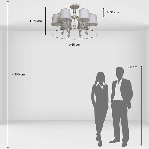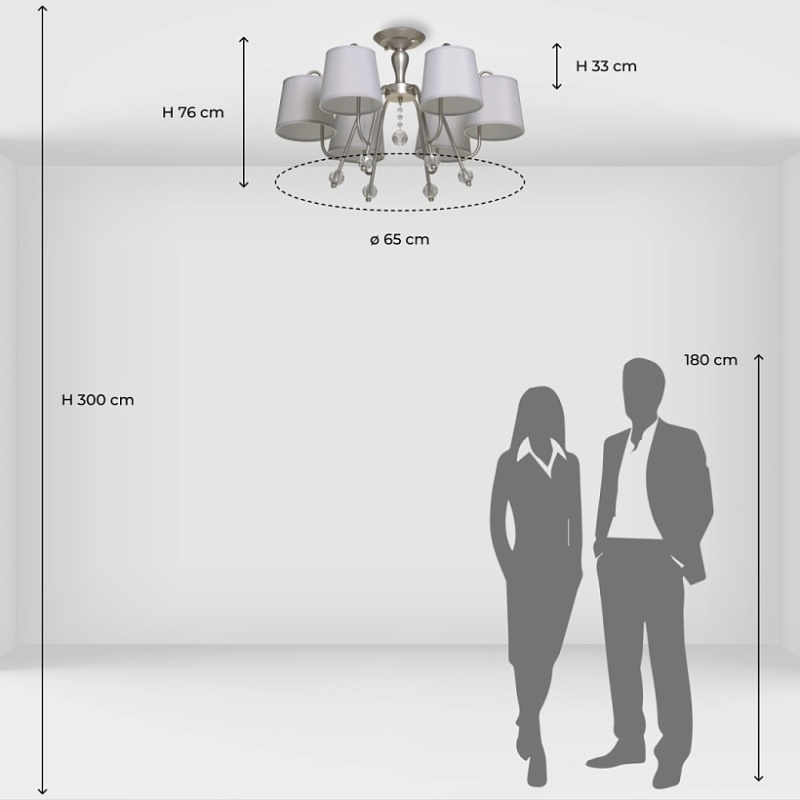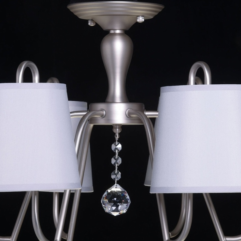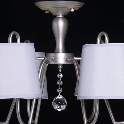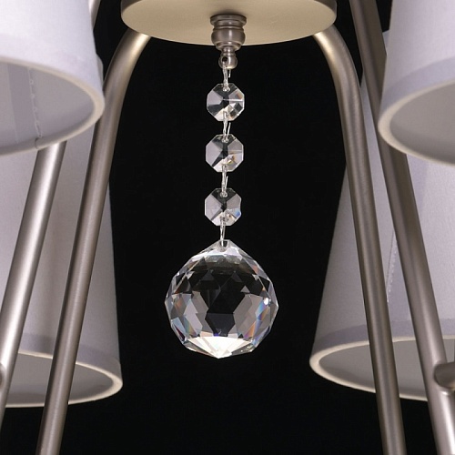 Металлическое основание подвесной люстры окрашено в цвет перламутрового серебра. Заменяемые источники света закрыты текстильными абажурами серого цвета. С внутренней стороны текстиль защищен прозрачным термостойким акрилом. Абажуры отделаны кантами и прошиты. Люстра декорирована прозрачным хрусталем.
