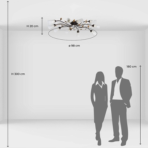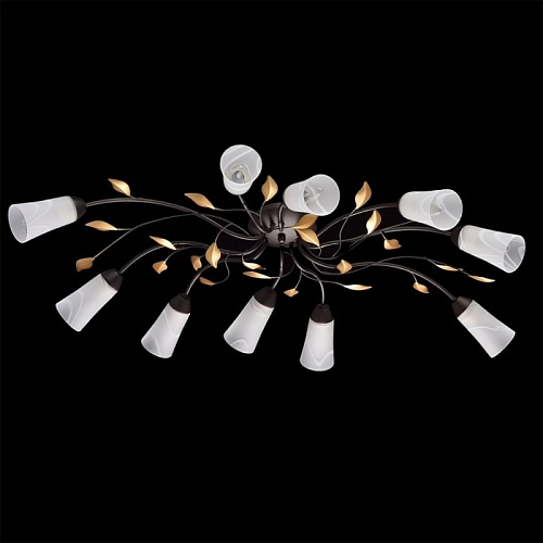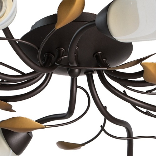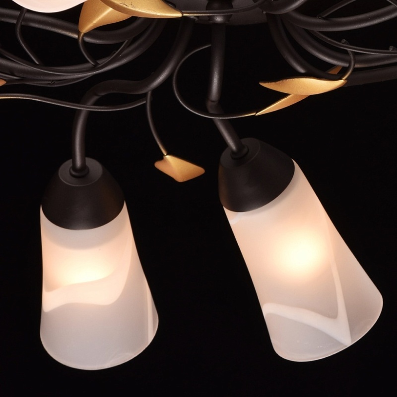 Основание: металл, окрашивание в коричневый цвет. Рожки и завитки выполнены по технологии проката на роликовом станке. Плафоны: стекло отлитое в форму, матирование, ручное окрашивание по поверхности.Декор: растительные элементы из металла, окрашивание в цвет золота.