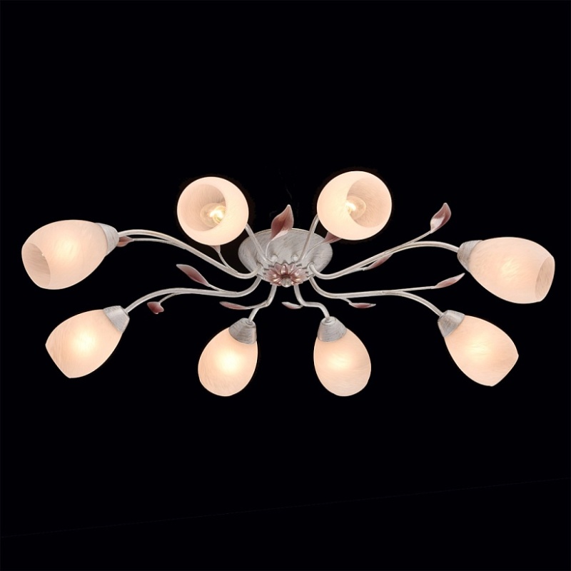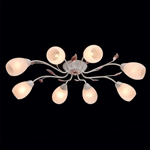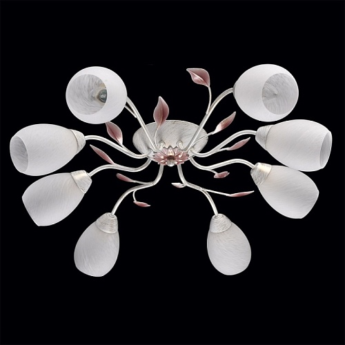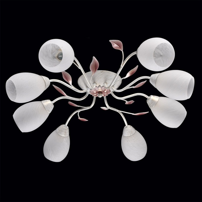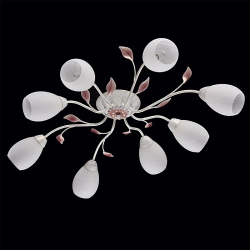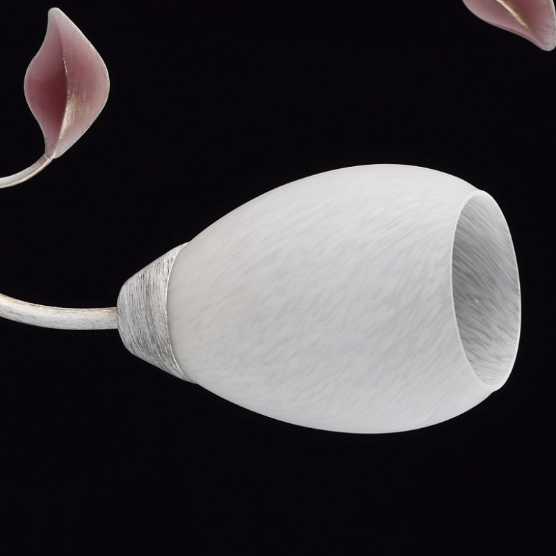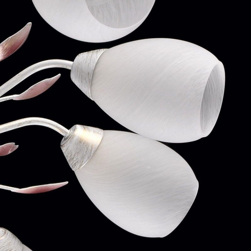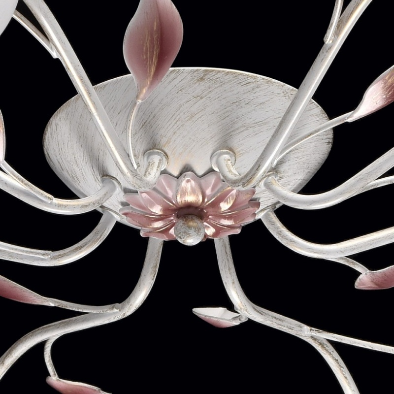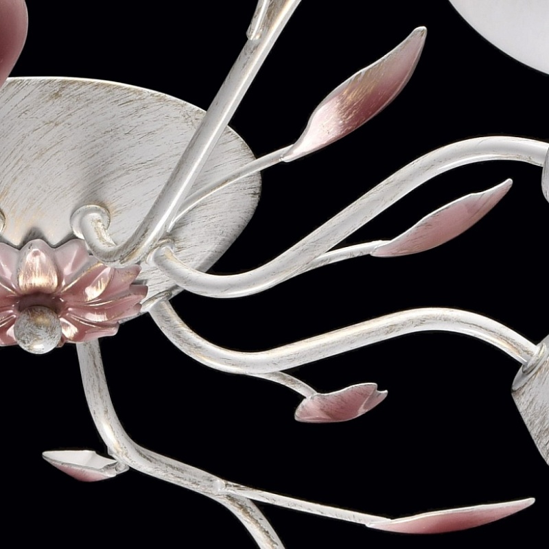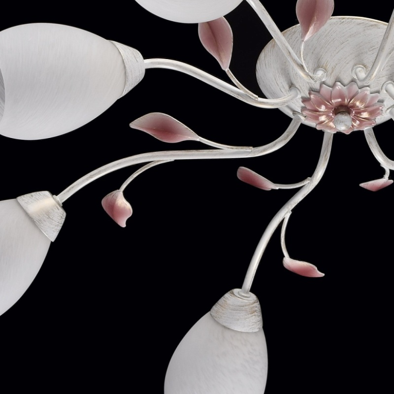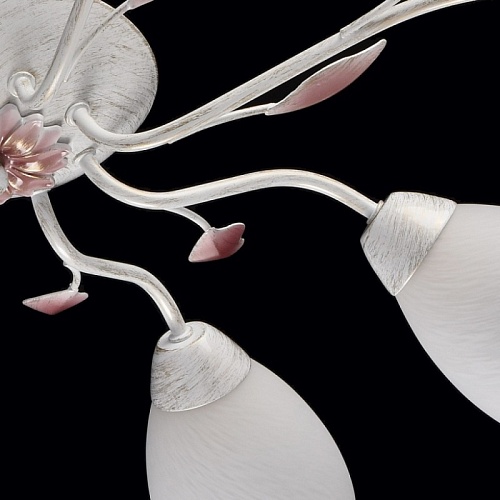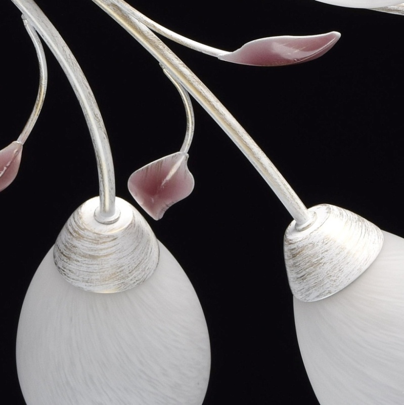 Основание: металл, окрашивание по технологии хай-лайт, основной цвет - белый, декоративный слой цвета золота. Рожки выполнены прокатом на роликовом станке.Декор: растительные элементы из металла, выполнены по технологии прессования, градуировано окрашены в розовый цвет. Плафоны: алебастровое стекло, матирование.