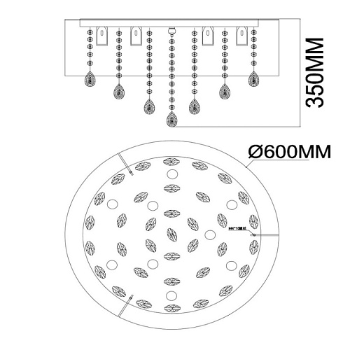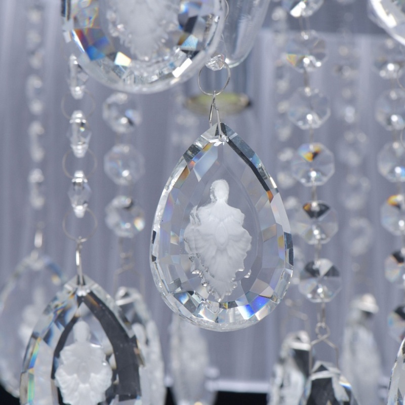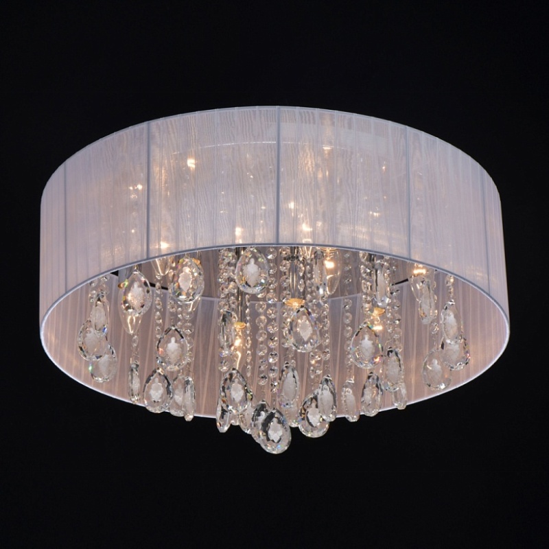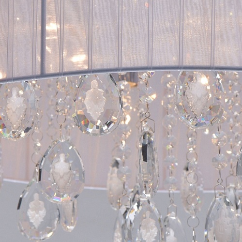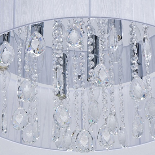 Основание светильника закрыто пластиной из нержавеющей стали, отполированной до зеркального блеска. Плафон выполнен из органзы белого цвета. Светильник декорирован прозрачным хрусталем с резной инкрустацией в центре, окрашенной в белый цвет.