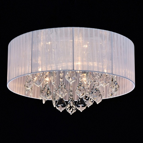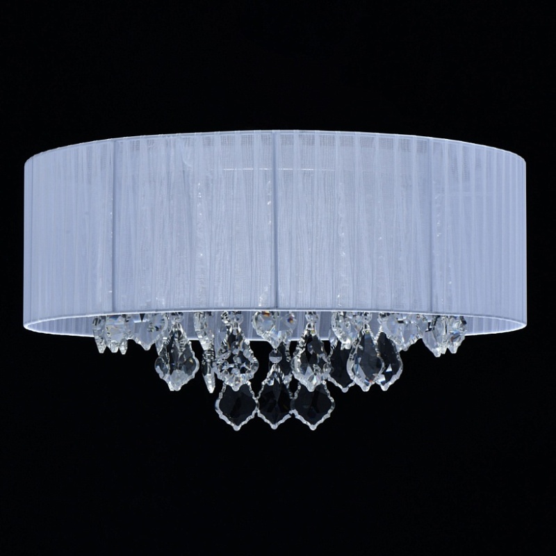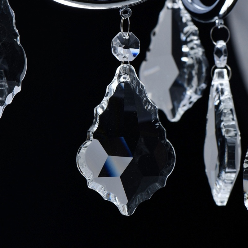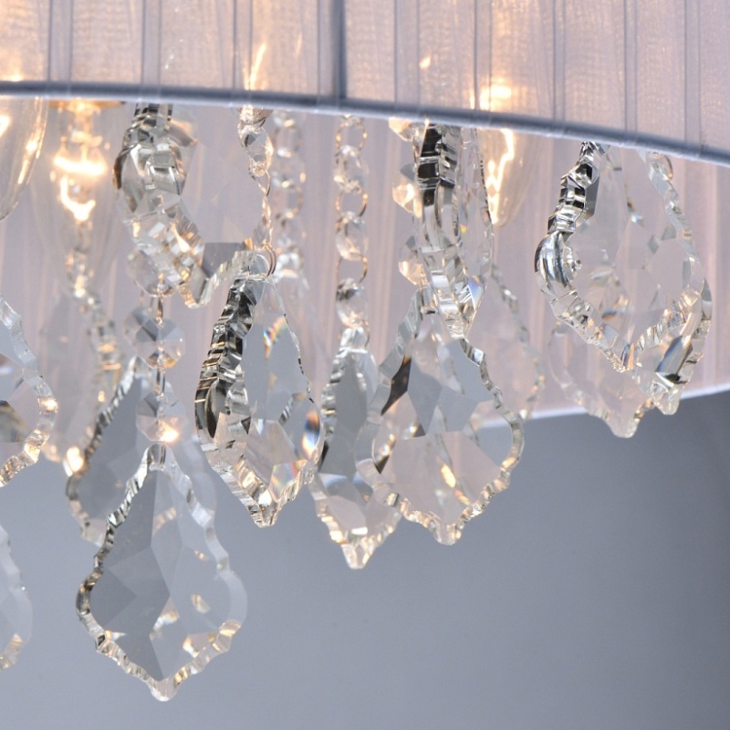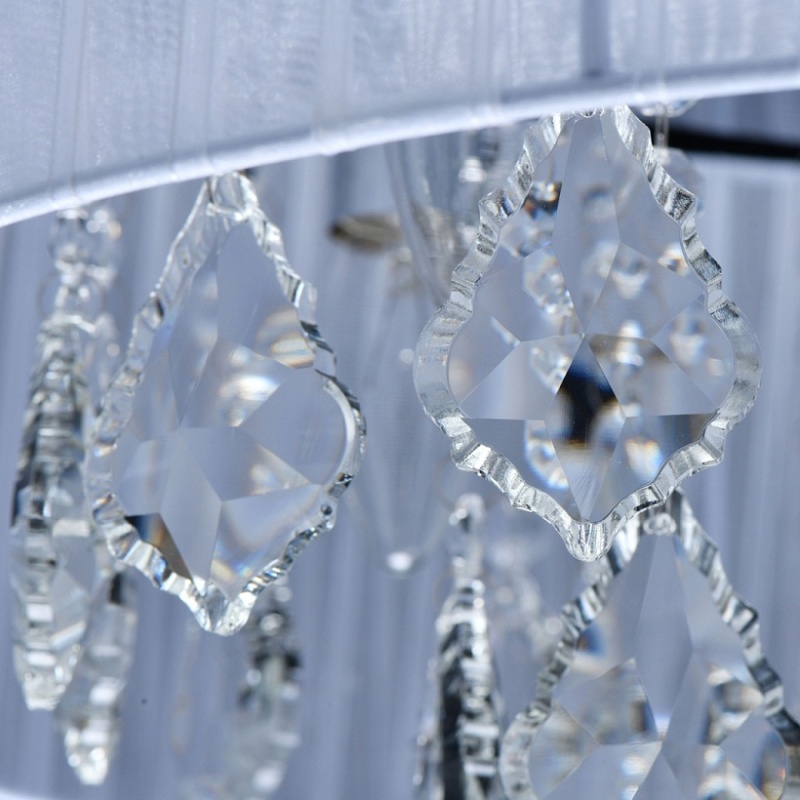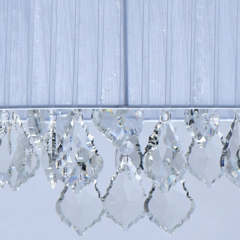 Основание светильника выполнено из металла и гальванизировано в цвет хрома. Плафон выполнен из органзы белого цвета. Светильник декорирован прозрачным хрусталем формы октагон и дубовый лист.
