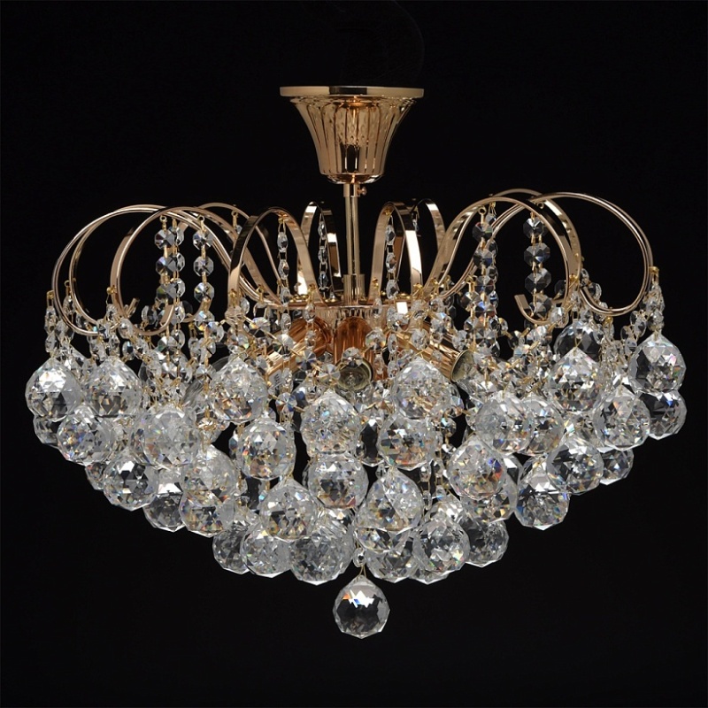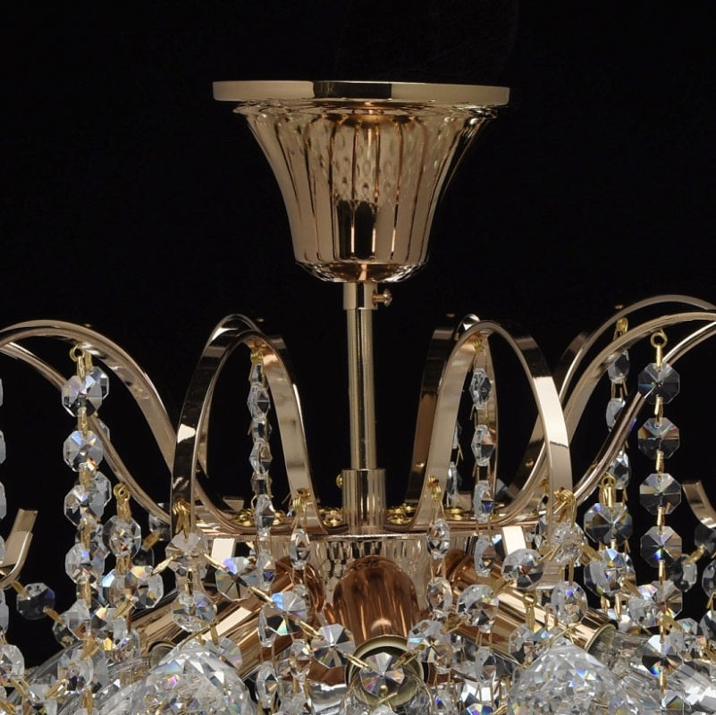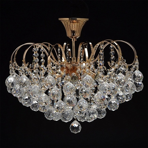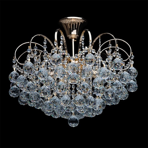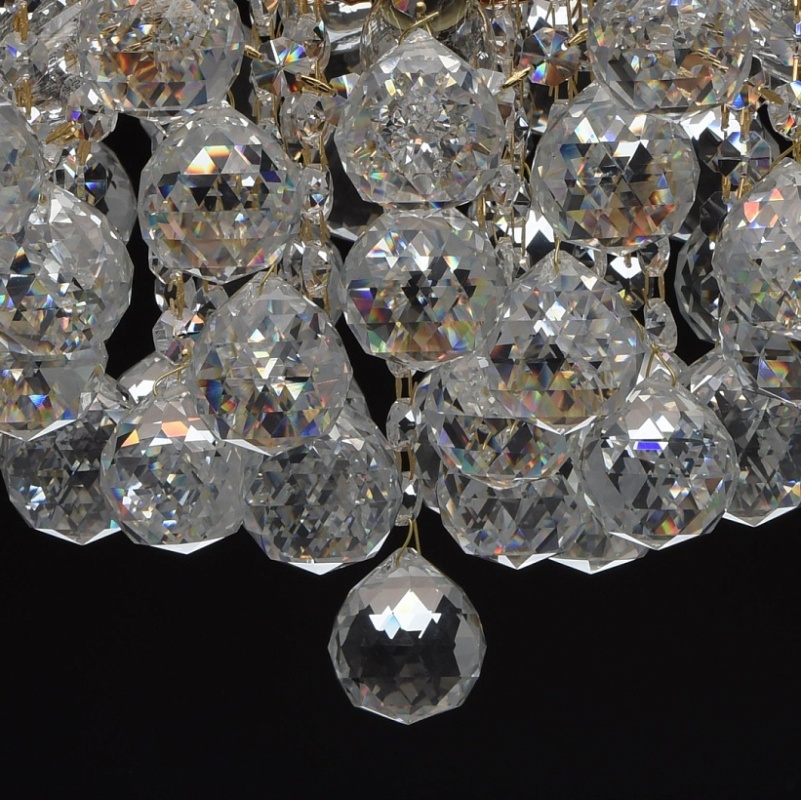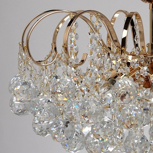 Арматура светильника выполнена из сплава металла и гальванизирована в цвет французского золота. Светильник декорирован подвесами из хрусталя сложной огранки.