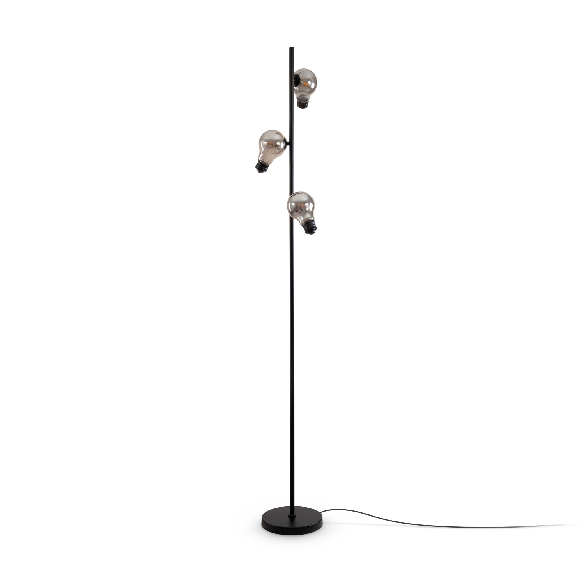 Металлическая арматура, цвета — чёрный и латунь. Прозрачные плафоны-лампочки из стекла в тон арматуры хаотично “разбросаны” по острову светильника. Подвесы регулируются по высоте. Источник света — лампа с цоколем G9.