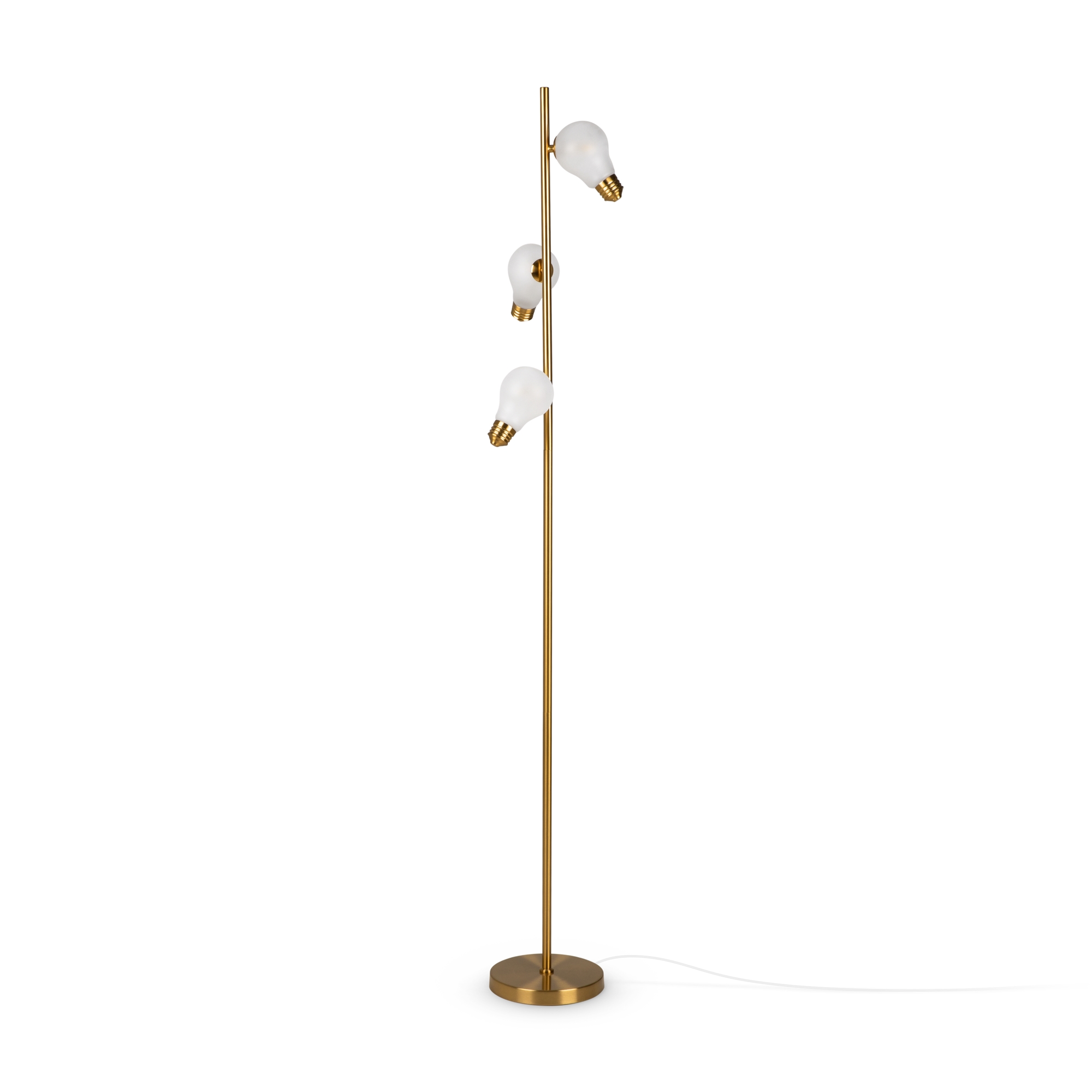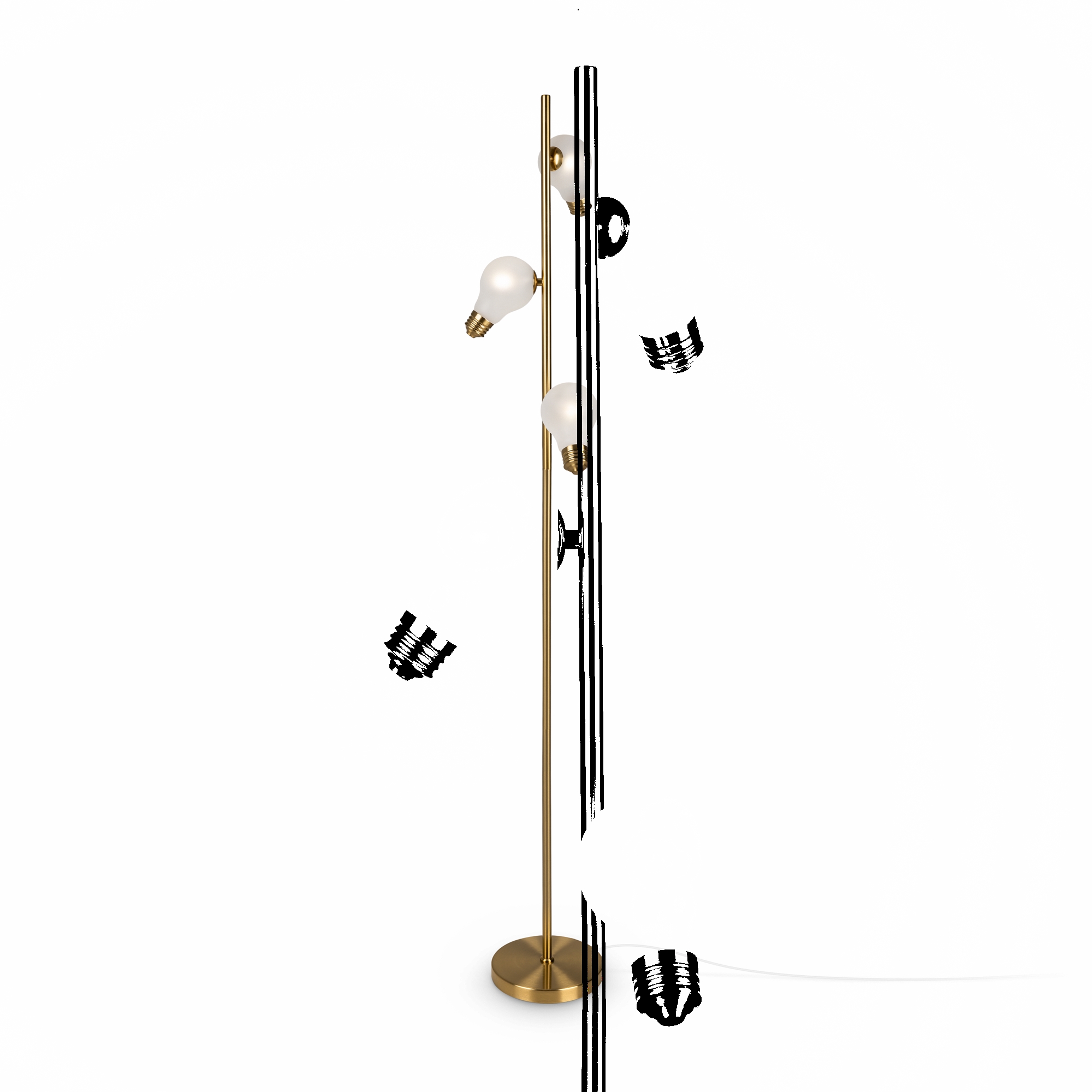 Металлическая арматура, цвета — чёрный и латунь. Прозрачные плафоны-лампочки из стекла в тон арматуры хаотично “разбросаны” по острову светильника. Подвесы регулируются по высоте. Источник света — лампа с цоколем G9.