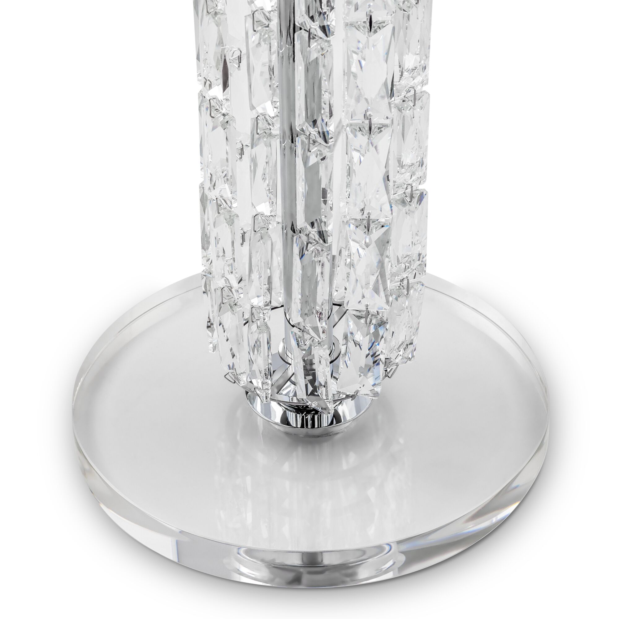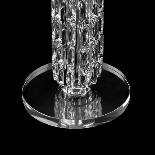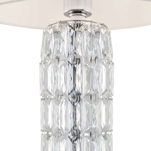 Арматура из металла, цвет – хром. Абажуры из текстиля, нанесенного на ПВХ. Цвет – белый. Декор – массивные кристаллы сложной огранки. Высота подвесных моделей регулируется.