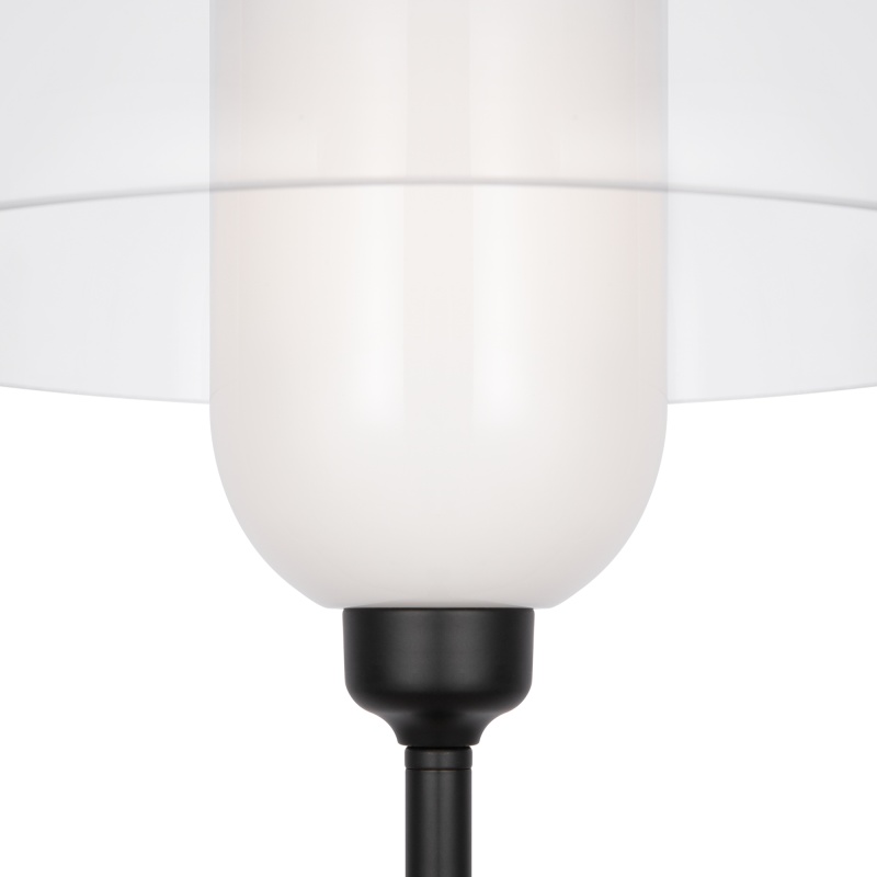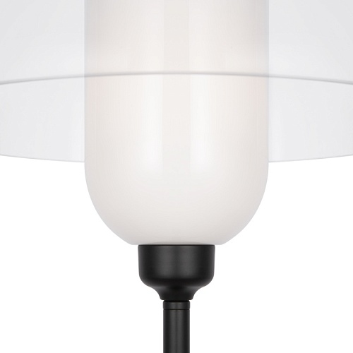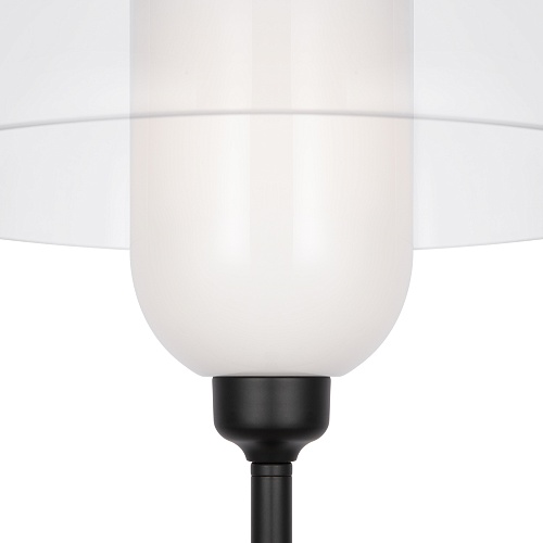 Металлическая арматура, цвет - черный. Светильники стилизованы под форму песочных часов с обтекаемой формой. Керамические элементы с глянцеовй глазурью. Подвесные светильники с плафонами из белой керамики с прозрачным, черно-белым, золото-белым и белым стеклом. Регулируемая высота подвесных светильников.