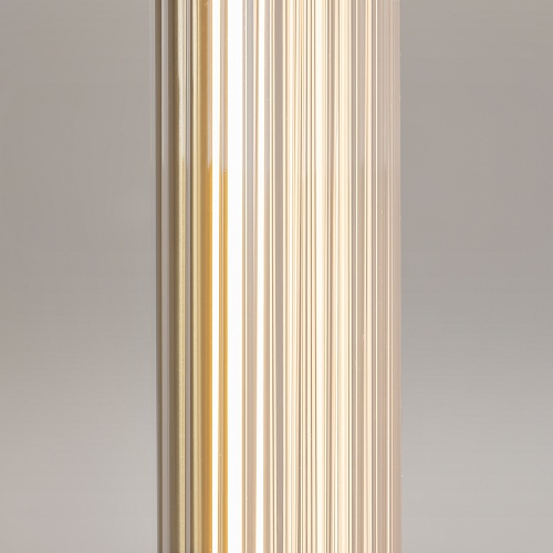 Арматура из металла, цвет - латунь с сатиновым финишем. Плафон из рифленого прозрачного стекла. LED-источник света. Теплая цветовая температура 3000К. Регулируемый по длине провод 3 метра у подвесного светильника. Подходит для помещений с высокими потолками. Торшер с push-кнопкой на проводе для удобного включения и выключения.