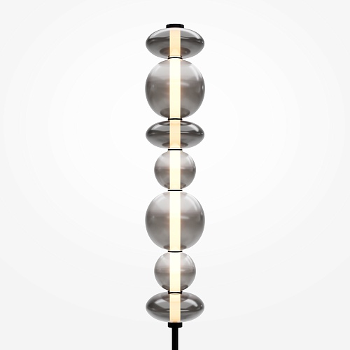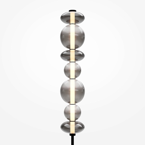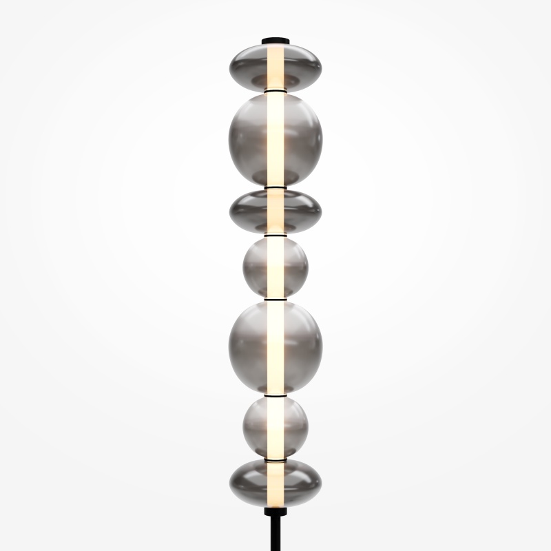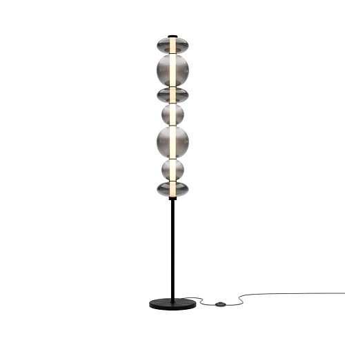 Светильники с тонированными выдувными стеклянными плафонами (дымчатыми или янтарными) и металлической арматурой (черной или цвета латуни). Окрашивание плафонов градиентное. Источник света: LED. Световой элемент установлен внутри акрилового рассеивателя. Цветовая температура источника света – 3000К, угол рассеивания — 120°. Торшеры снабжены Push-кнопкой на проводе.