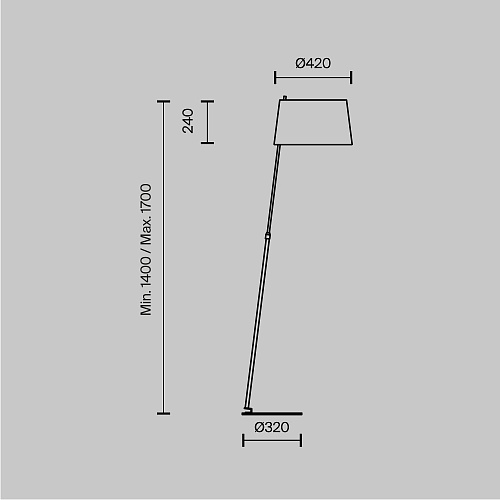Металлическая арматура. Три цветовых решения: белый и хром, черный и хром, хром. Абажур из текстиля и льна, нанесенного на ПВХ. Цвета — бежевый, серый, белый. Источник света в подвесных моделях скрыт под матовым стеклом. Торшеры и настольные лампы с регулируемым кронштейном. Лампа с цоколем Е27.