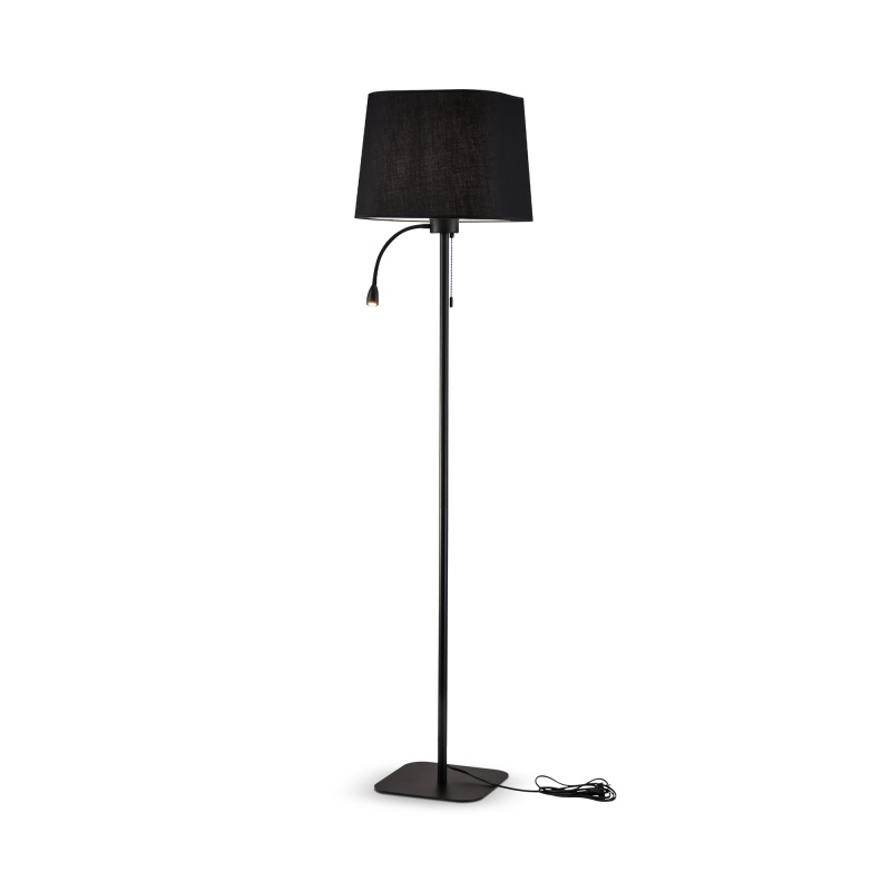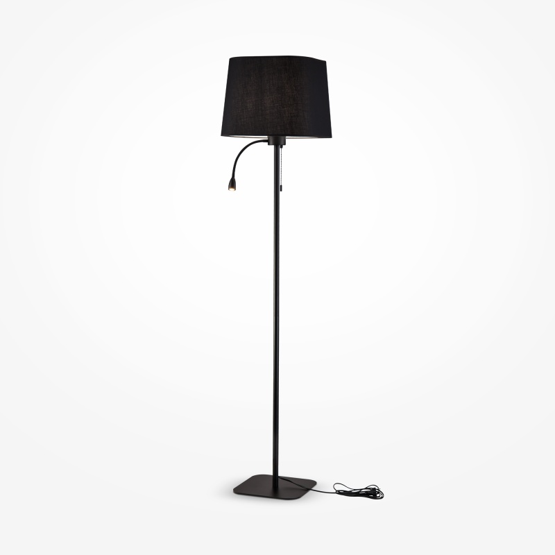 Металлическая арматура в белом и черном цвете. Материал абажура – текстиль, нанесенный на ПВХ, оттенки – белый и черный. LED-элемент для локальной под светки расширяет функционал модели.
