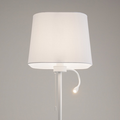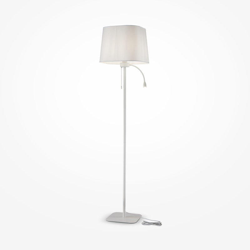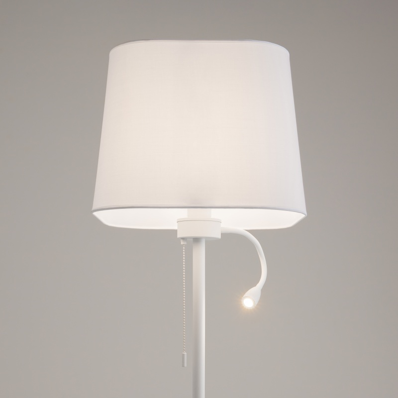 Металлическая арматура в белом и черном цвете. Материал абажура – текстиль, нанесенный на ПВХ, оттенки – белый и черный. LED-элемент для локальной под светки расширяет функционал модели.
