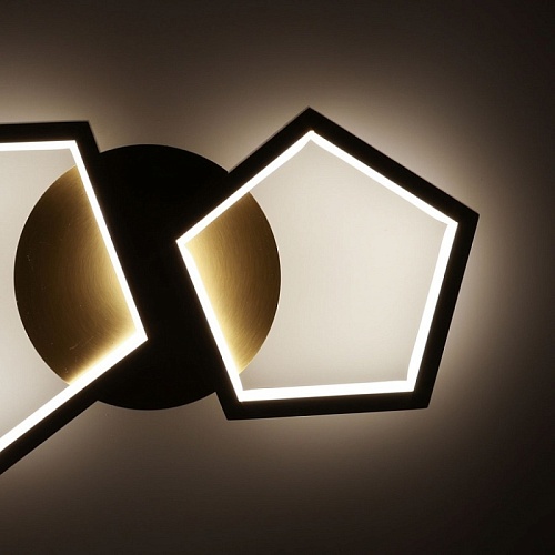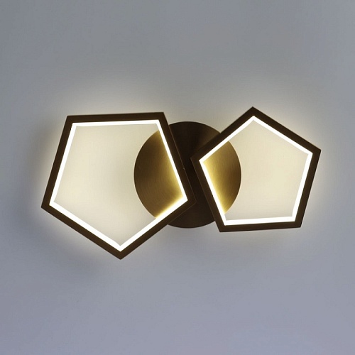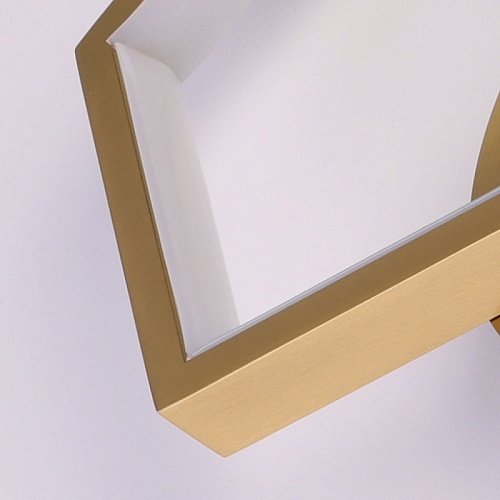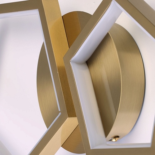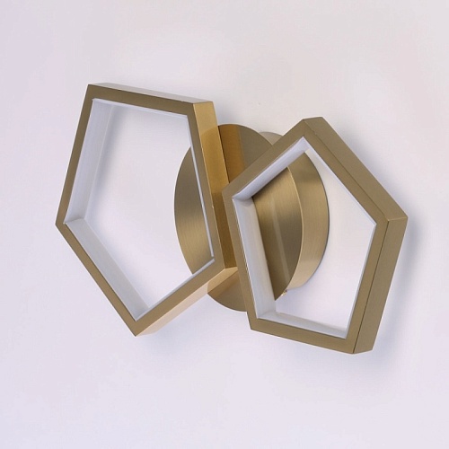 Металлическое основание настенного бра гальванизировано в цвет латуни. Многогранные плафоны выполнены из сплава алюминия с цинком, обработаны по технологии брашинг и гальванизированы в цвет основания. Светодиодный источник света закрыт белым матовым акрилом.